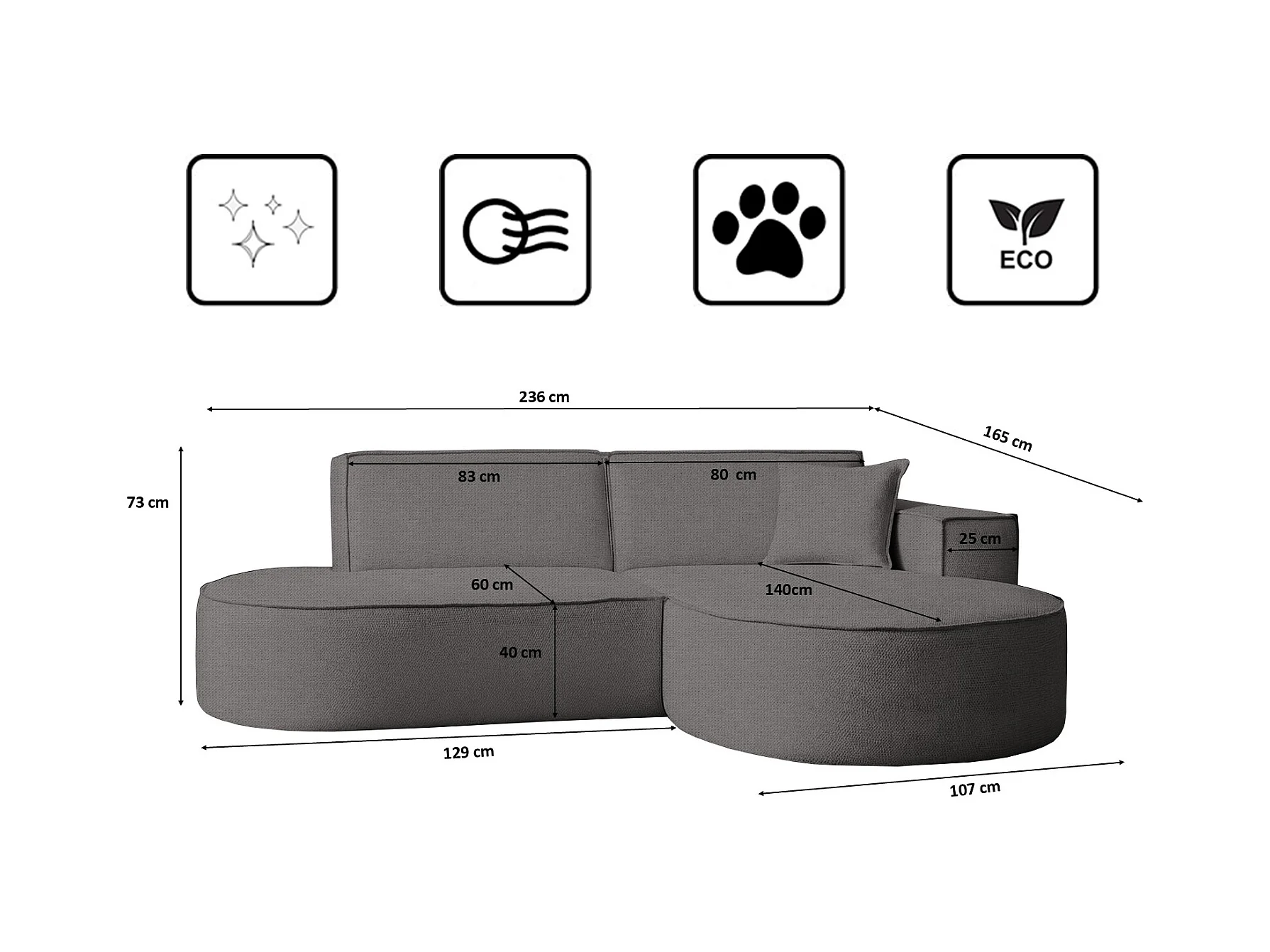 Canapé d'angle en L PULA, tissu Perfect Harmony, gris, droit