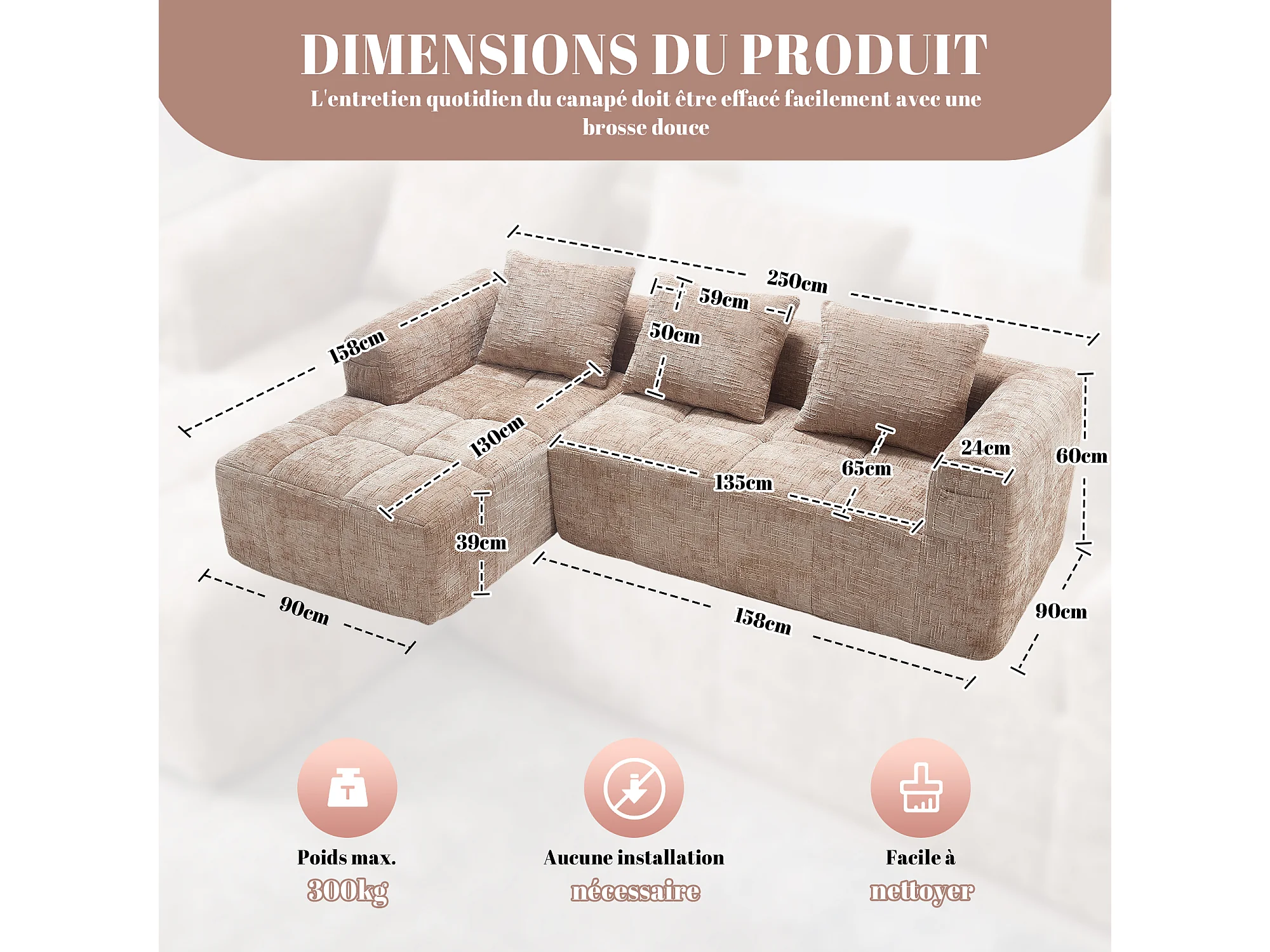Canapé d'Angle 3 Places en Chenille Taupe avec 3 Dossiers Amovibles avec Poche de Rangement - Confort Modulable