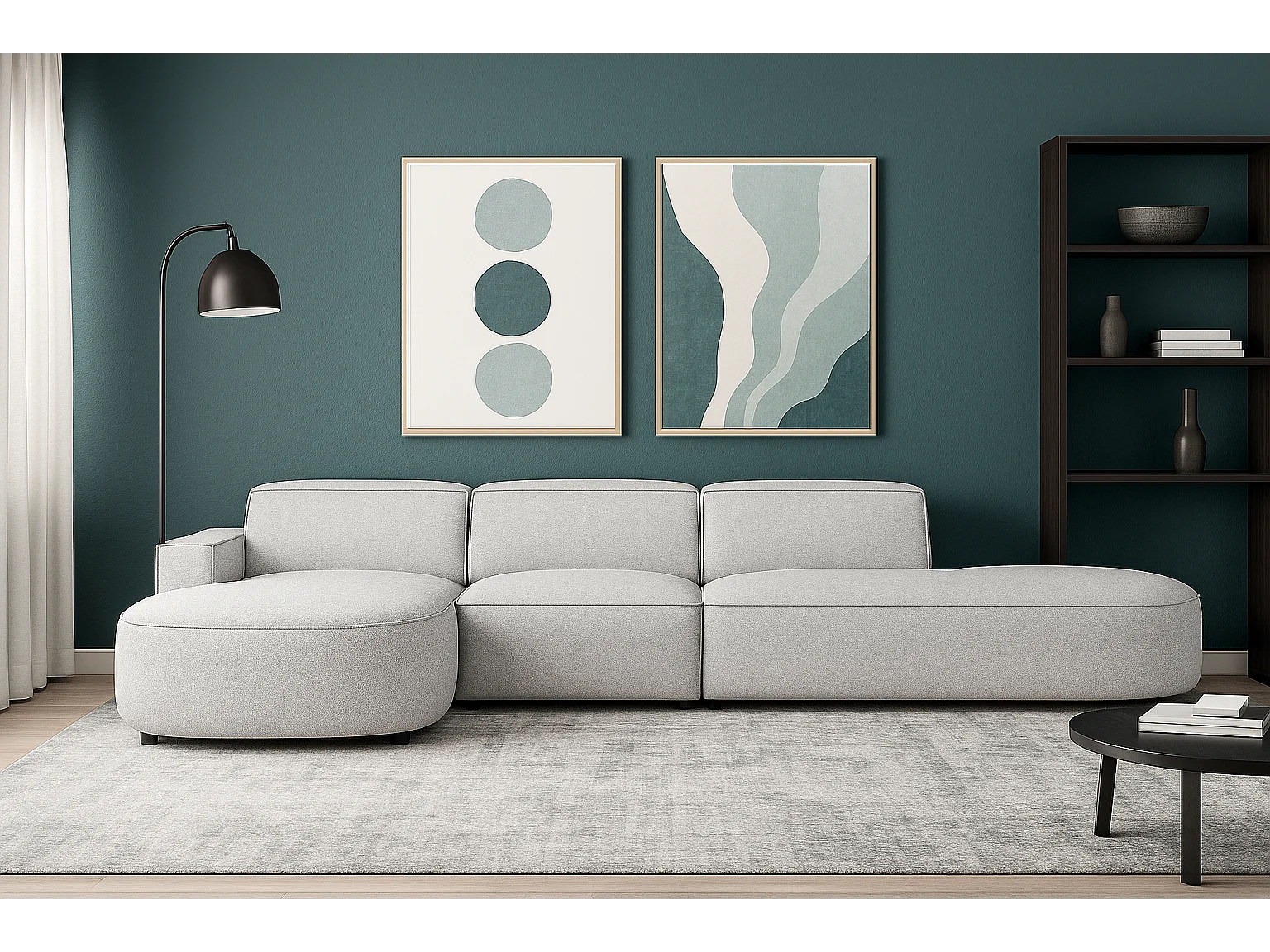 Canapé d’angle modulable CURSAL F – angle gauche, 364×166×70 cm, gris clair Raven 6, méridiennes arrondies, autoportant