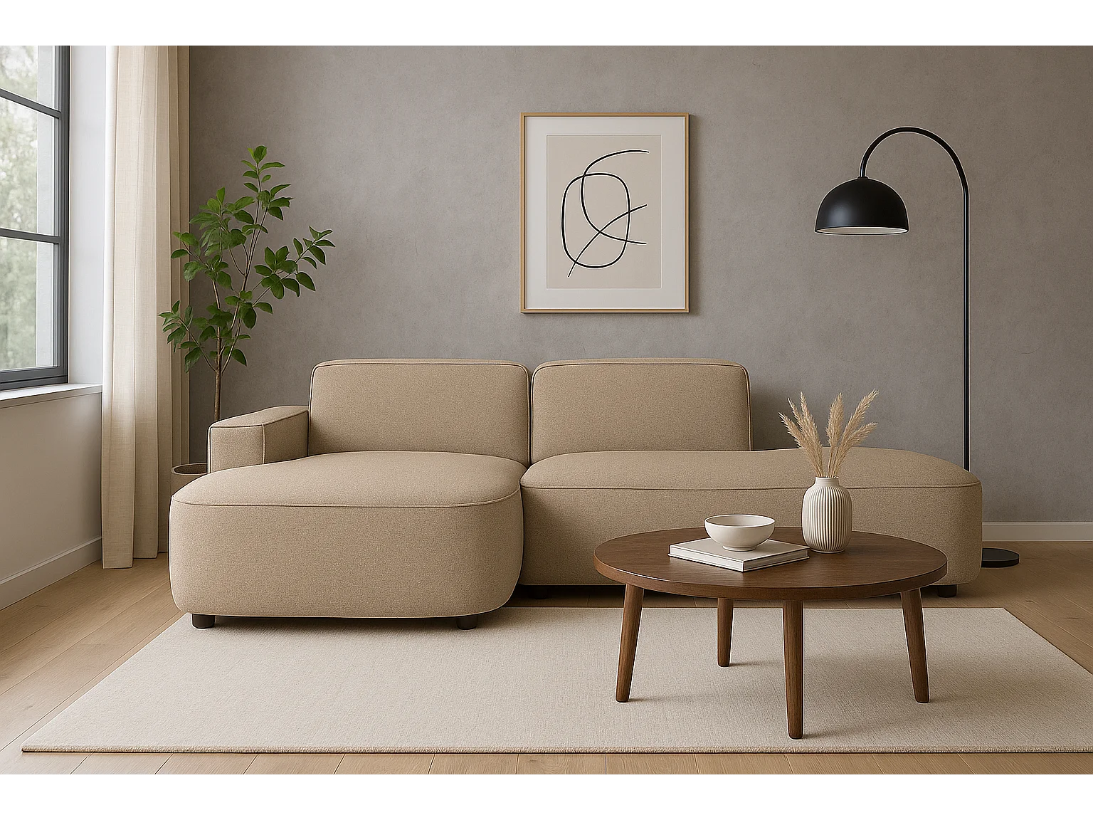 Canapé d’angle modulable CURSAL G – angle gauche, 284×166×70 cm, beige Raven 30 méridiennes arrondies, autoportant