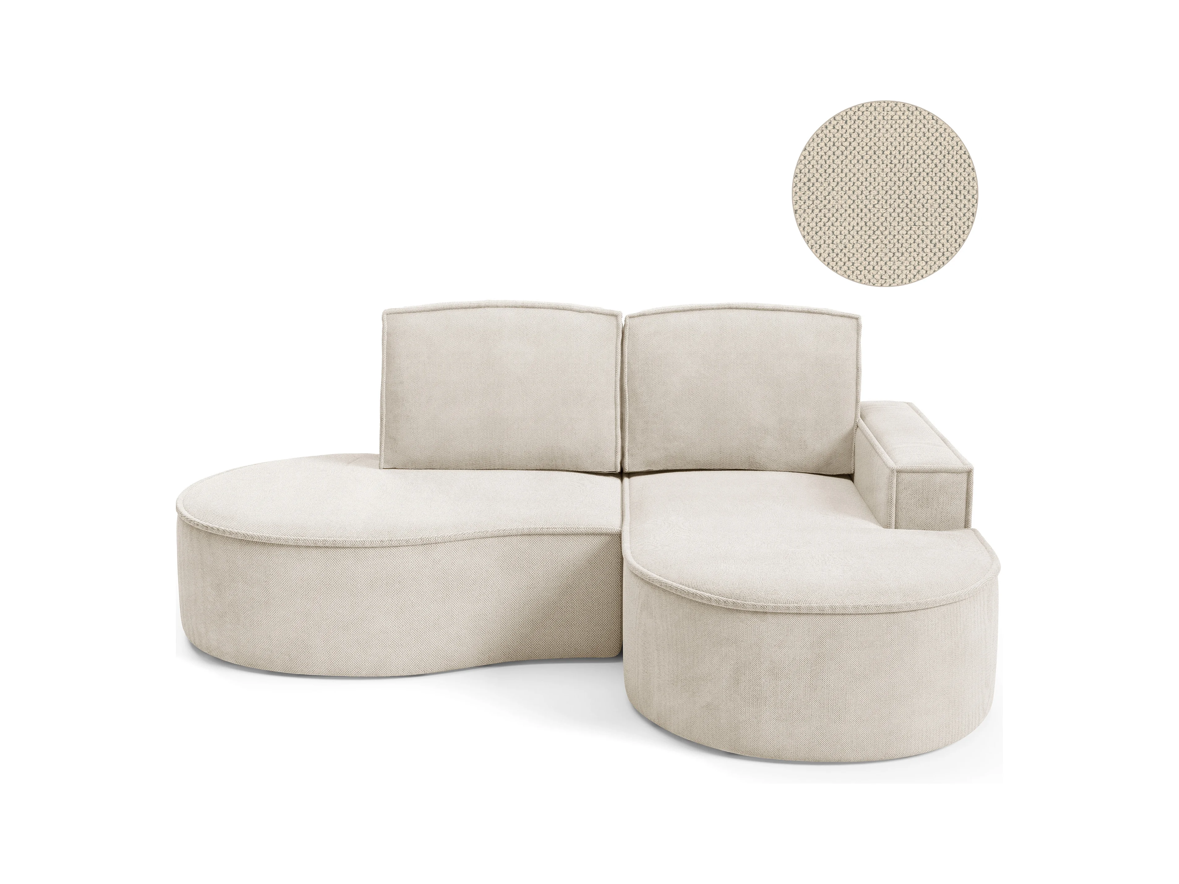 Canapé d'angle MOLLY sans couchage – Demi-lune, tissu Bouclé, coussins amovibles, revêtement doux, 210x157x88 cm, côté droit beige