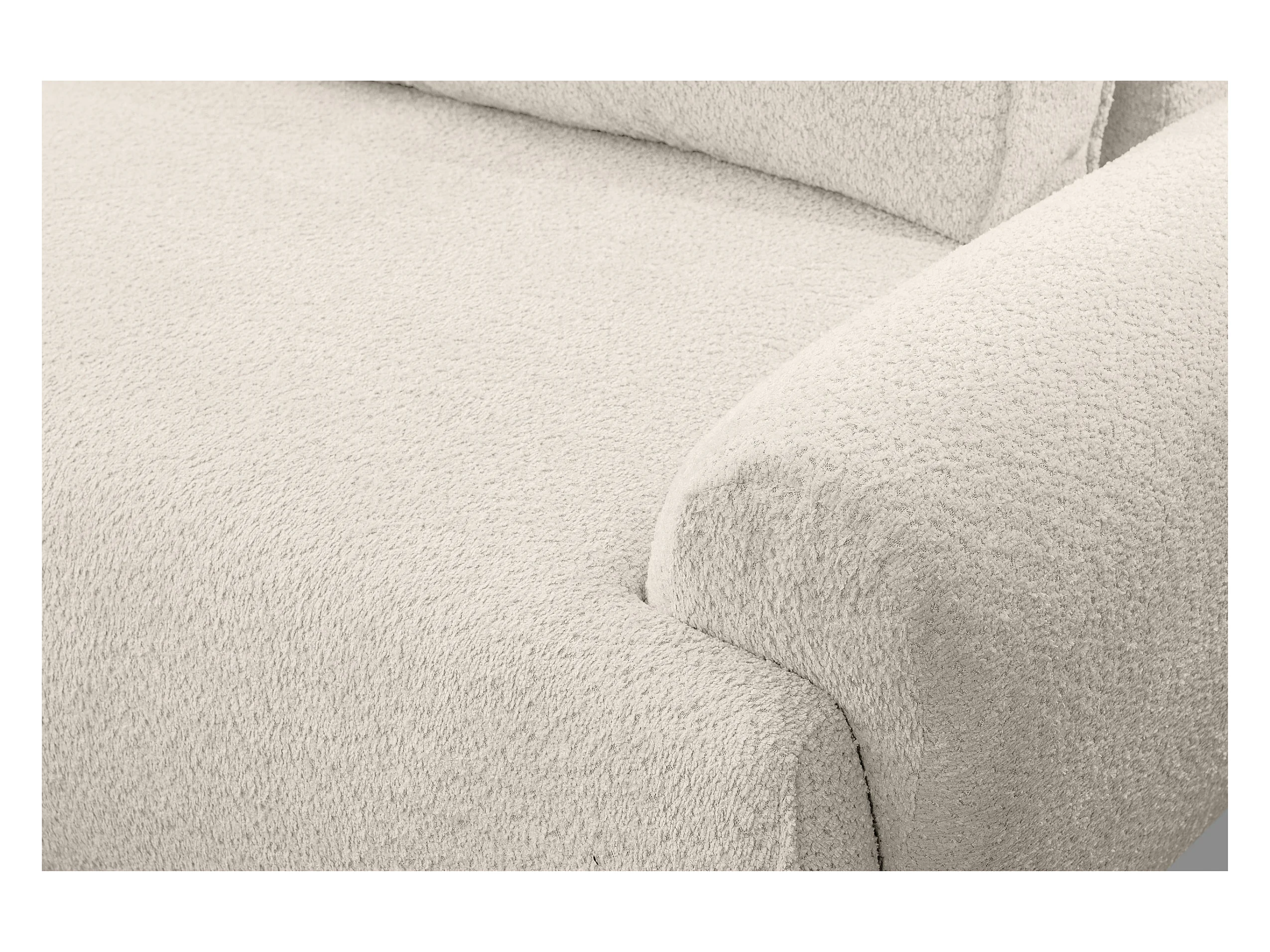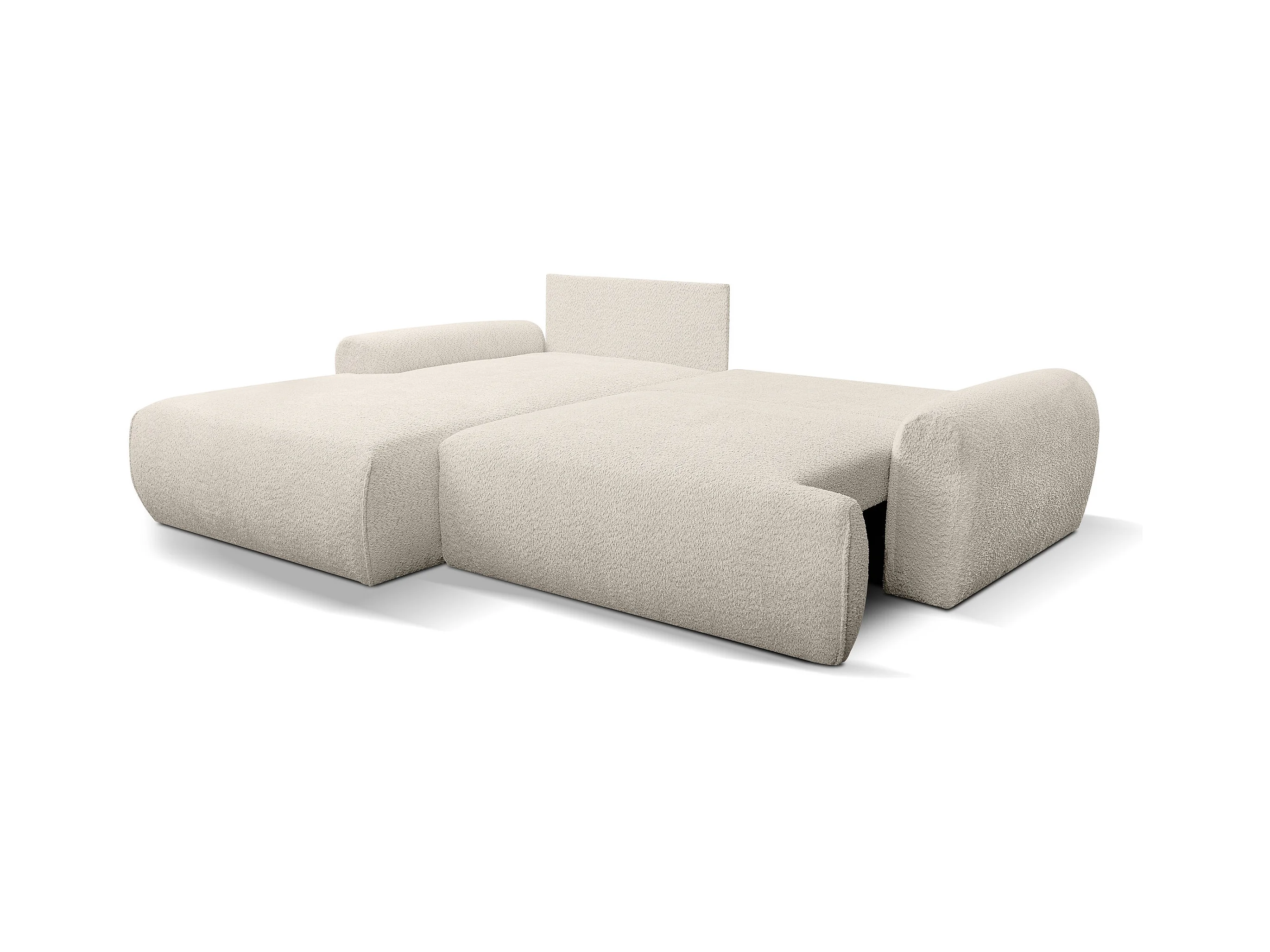 Canapé d'angle Moon avec fonction couchage et coffre de rangement, couleur : beige, tissu bouclé, pouf à gauche