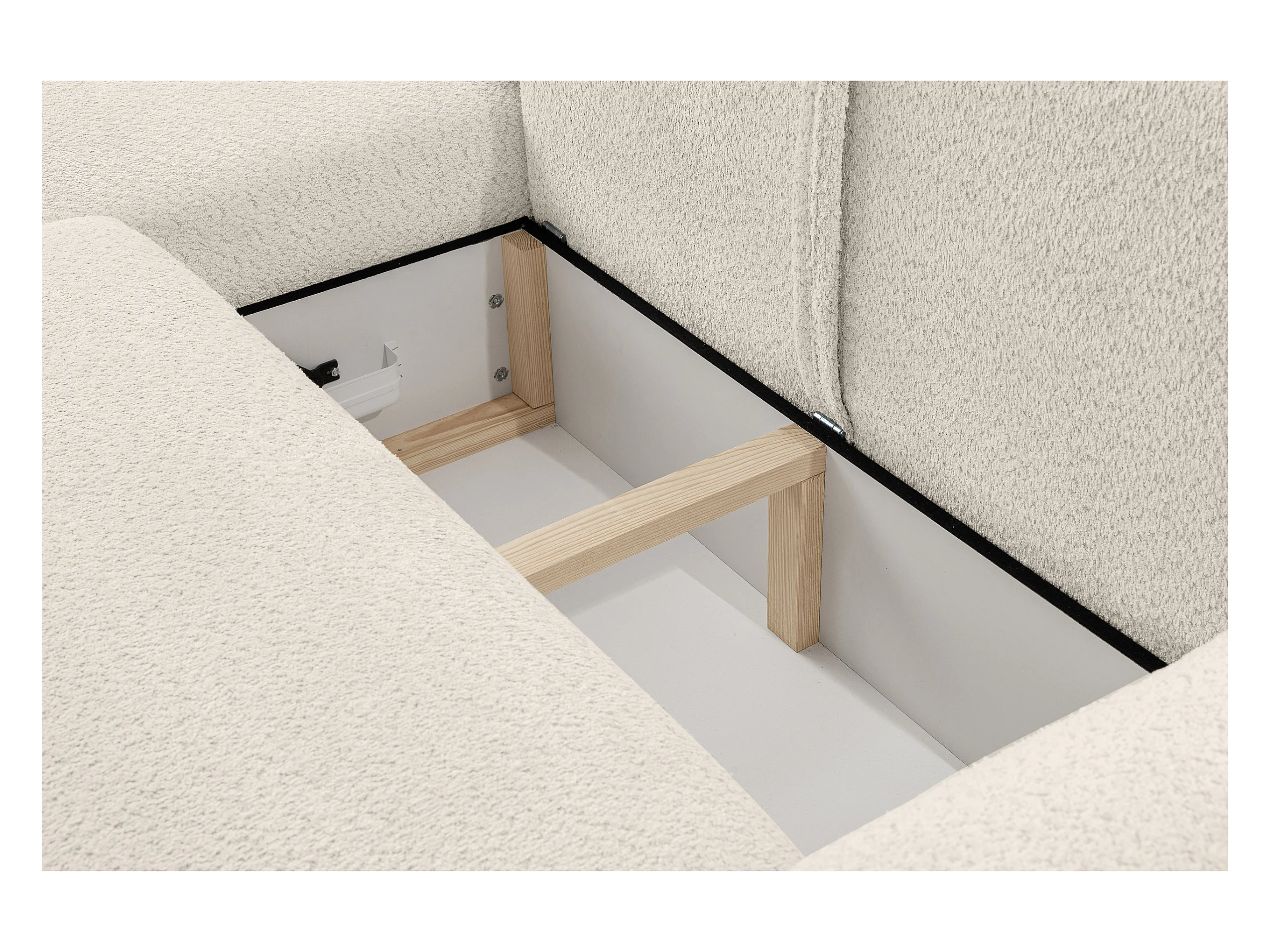 Canapé d'angle Dream avec fonction couchage et coffre de rangement, couleur : beige, tissu bouclé, pouf à droite