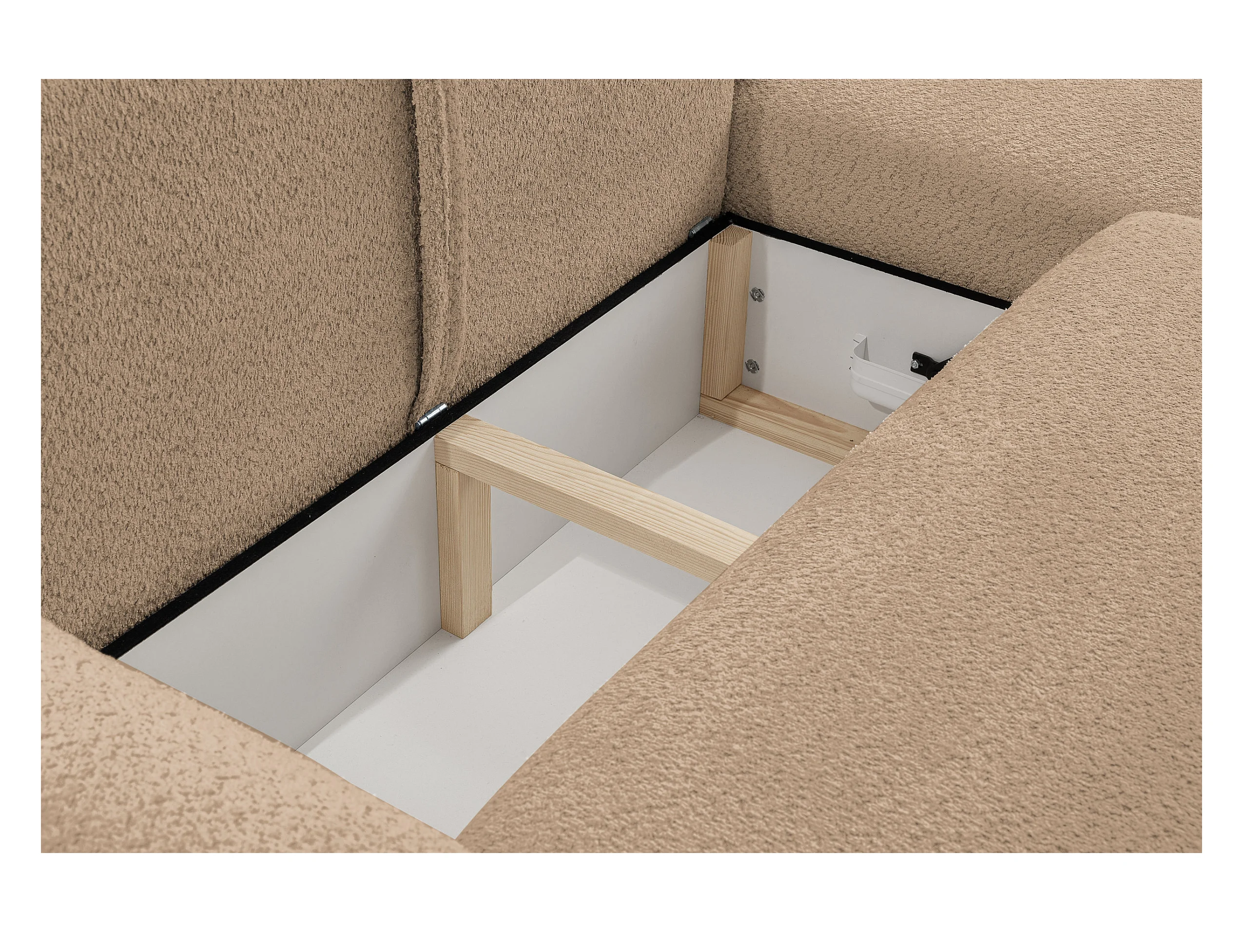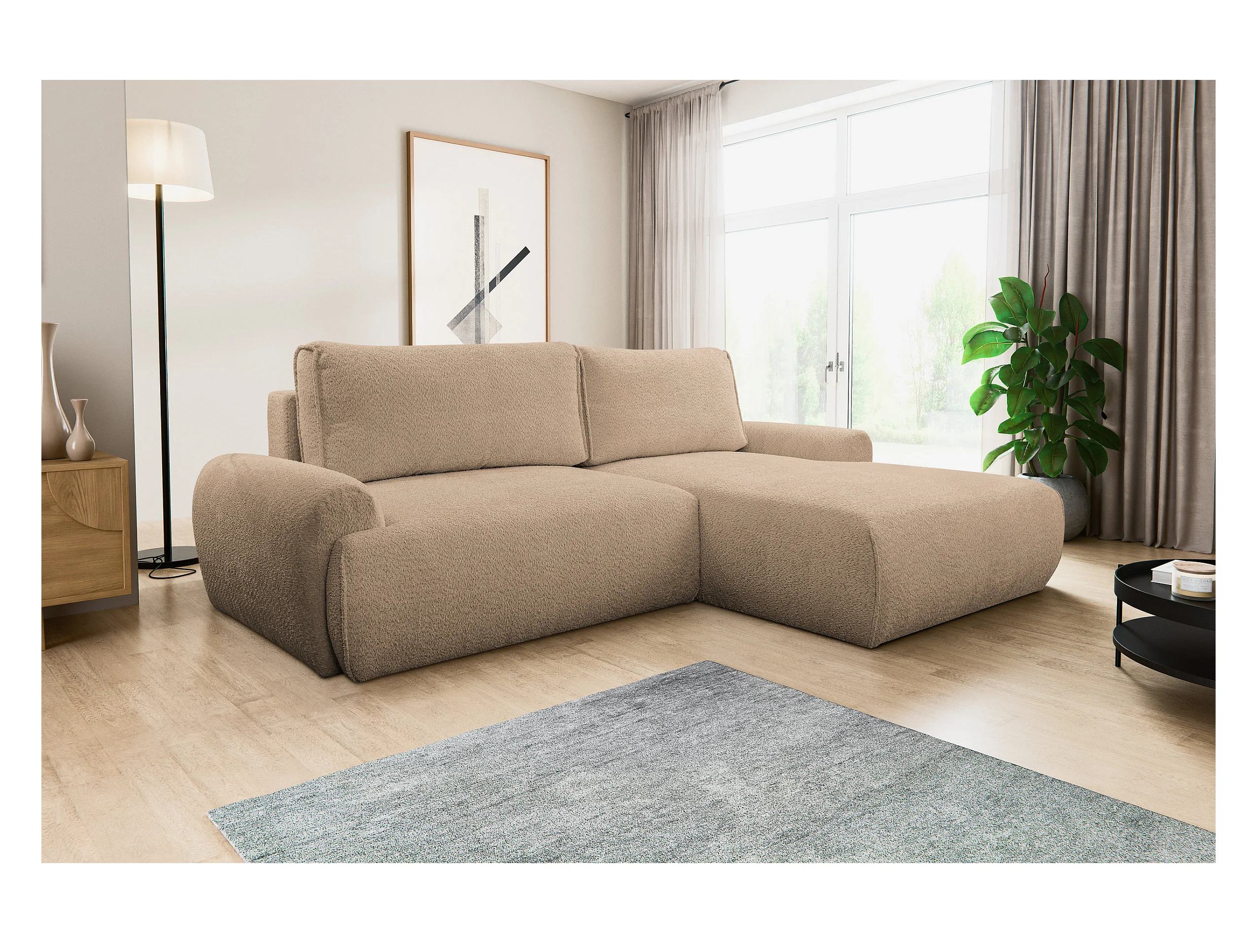 Canapé d'angle Moon avec fonction couchage et coffre de rangement, couleur : marron clair, tissu bouclé, pouf à gauche