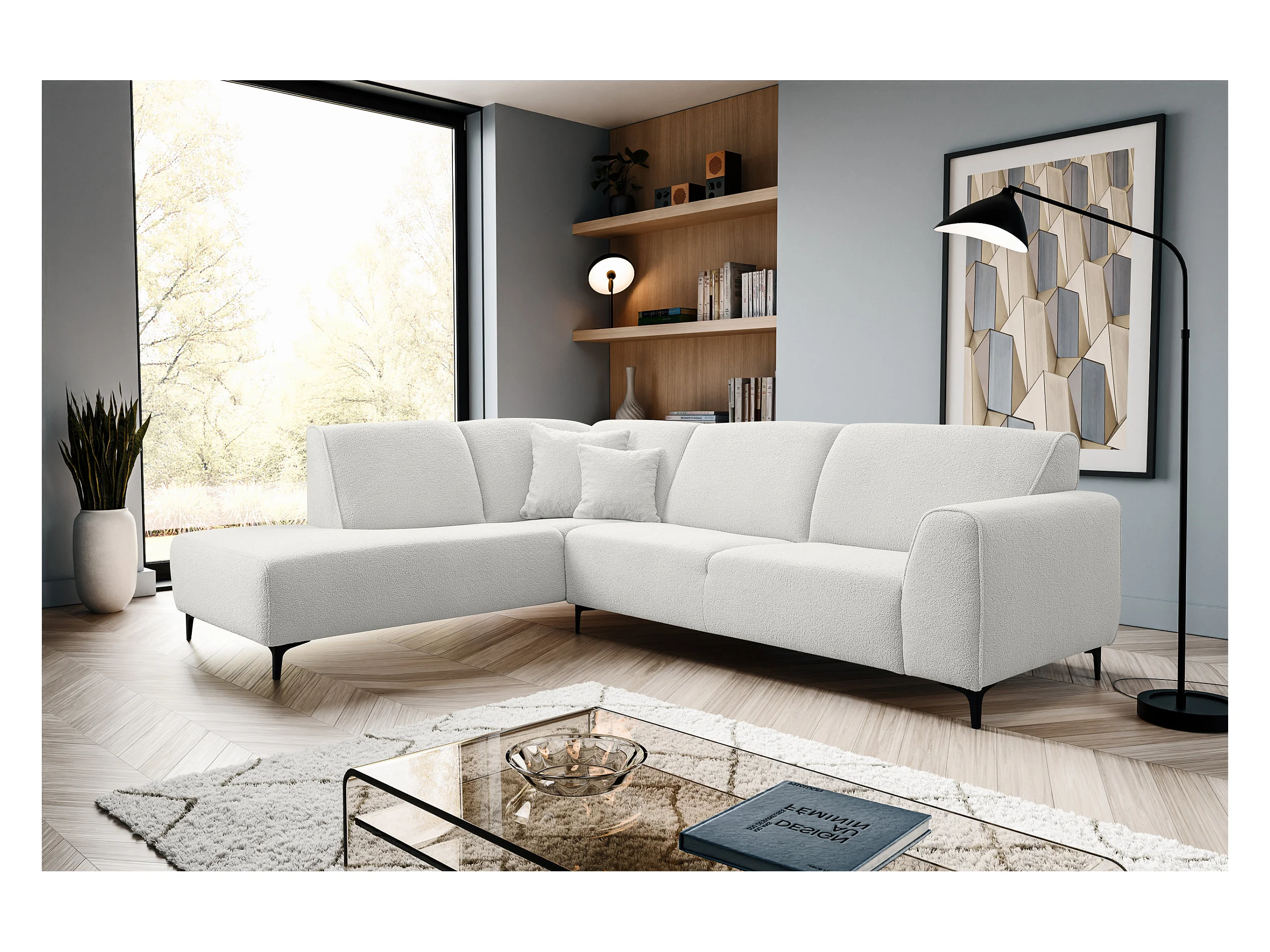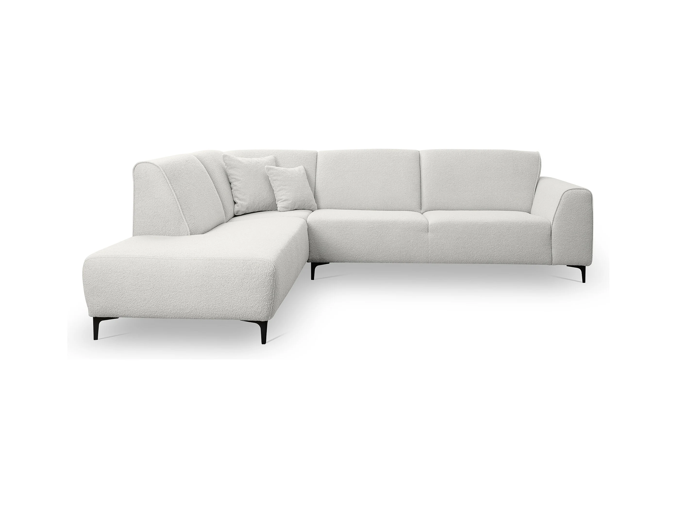 Canapé d'angle Mula, couleur Coach : blanc, tissu bouclé, pouf à gauche