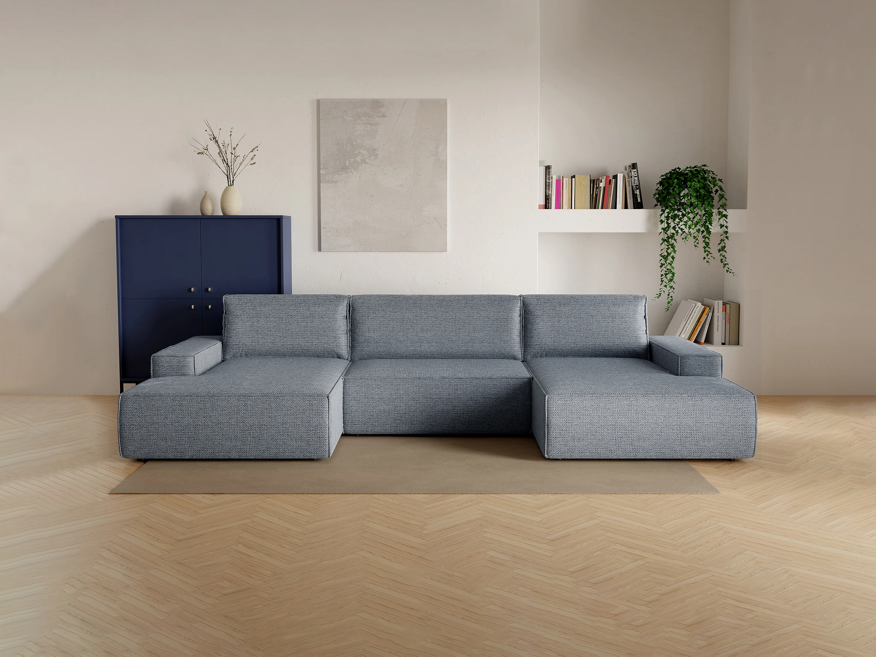 Grand canapé d'angle panoramique convertible en tissu texturé bleu AMELIA