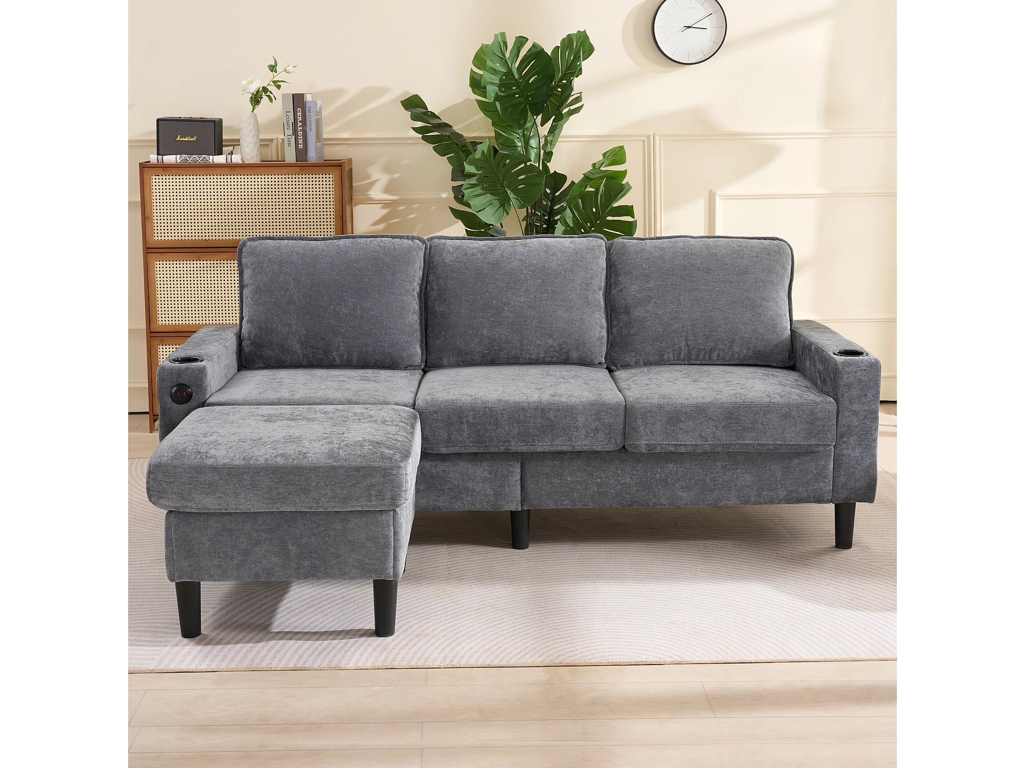 Canapé d'angle reversible 3 places en lin gris, avec ports USB et type-C - 202x137x80cm