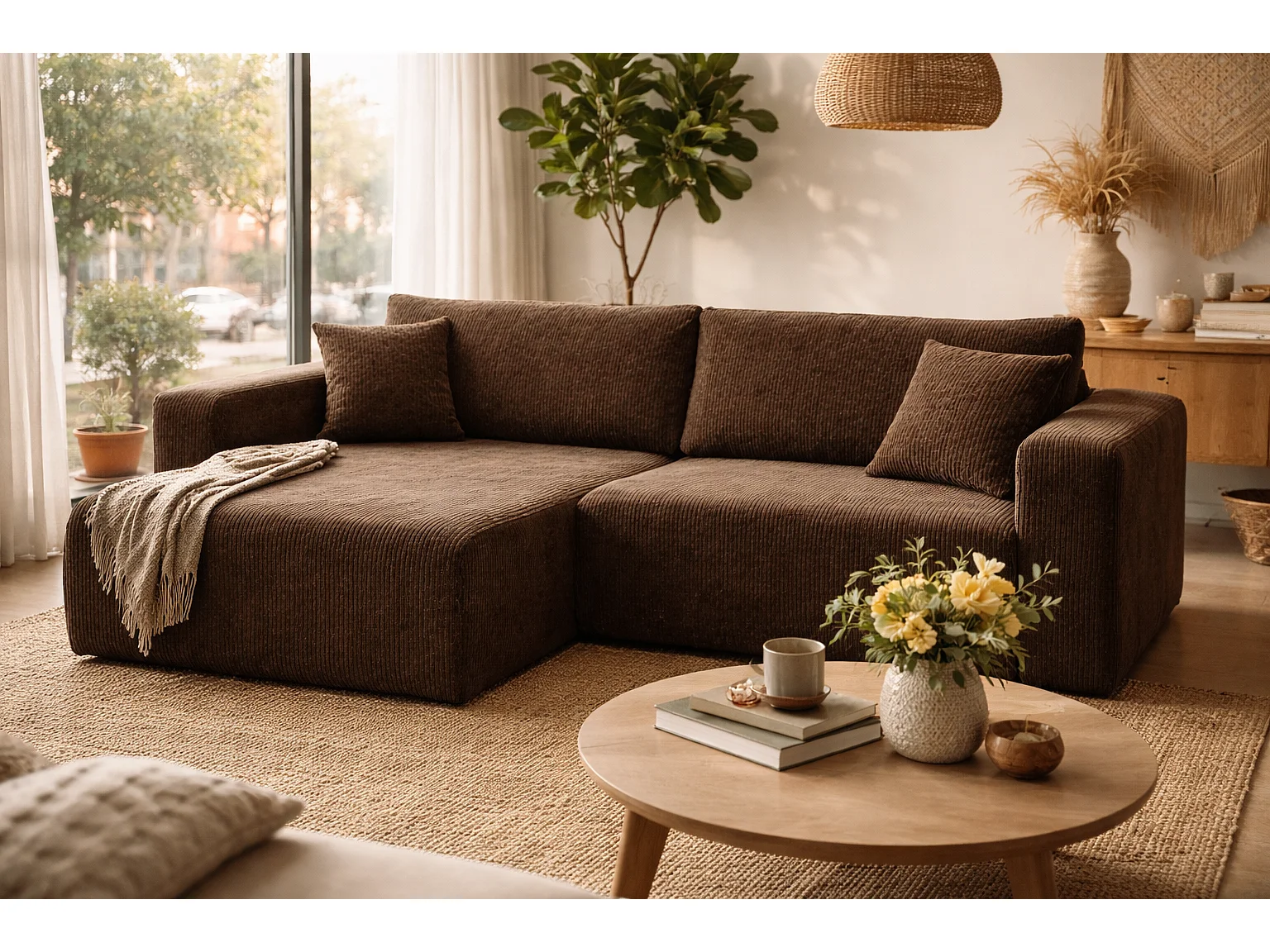 Canapé d'Angle réversible convertible avec fonction de couchage coffre universel en velours côtelé brun chocolat Flora L