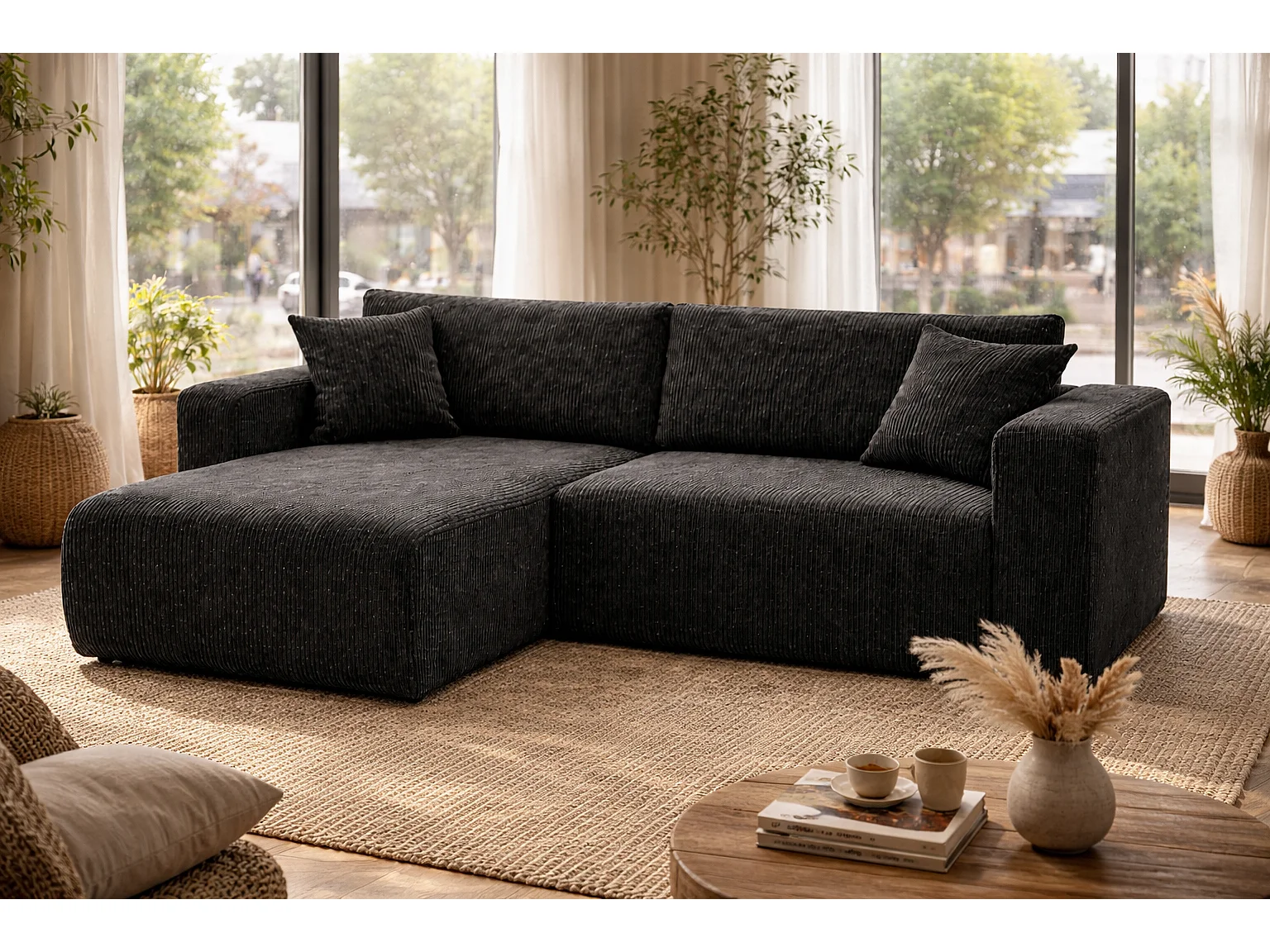 Canapé d'Angle réversible convertible avec fonction de couchage coffre universel en velours côtelé noir Flora L
