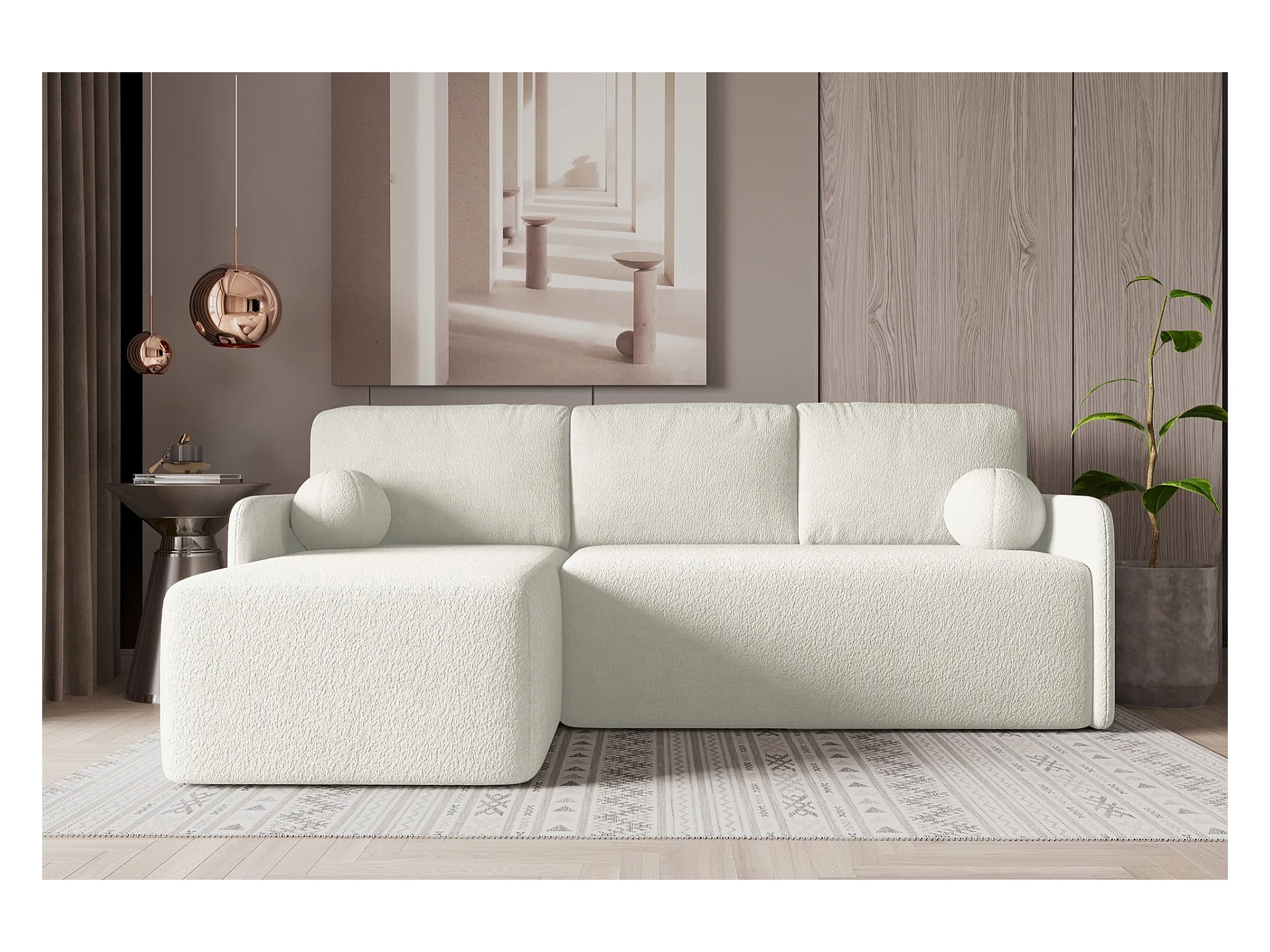 Canapé d'angle convertible - en bouclé crème avec revêtement - côté gauche - DANDELINO