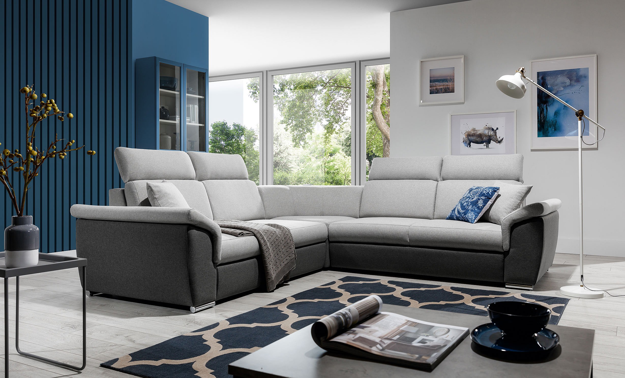 Canapé convertible moderne angle gauche tissu doux gris clair et gris foncé Plazo 278cm