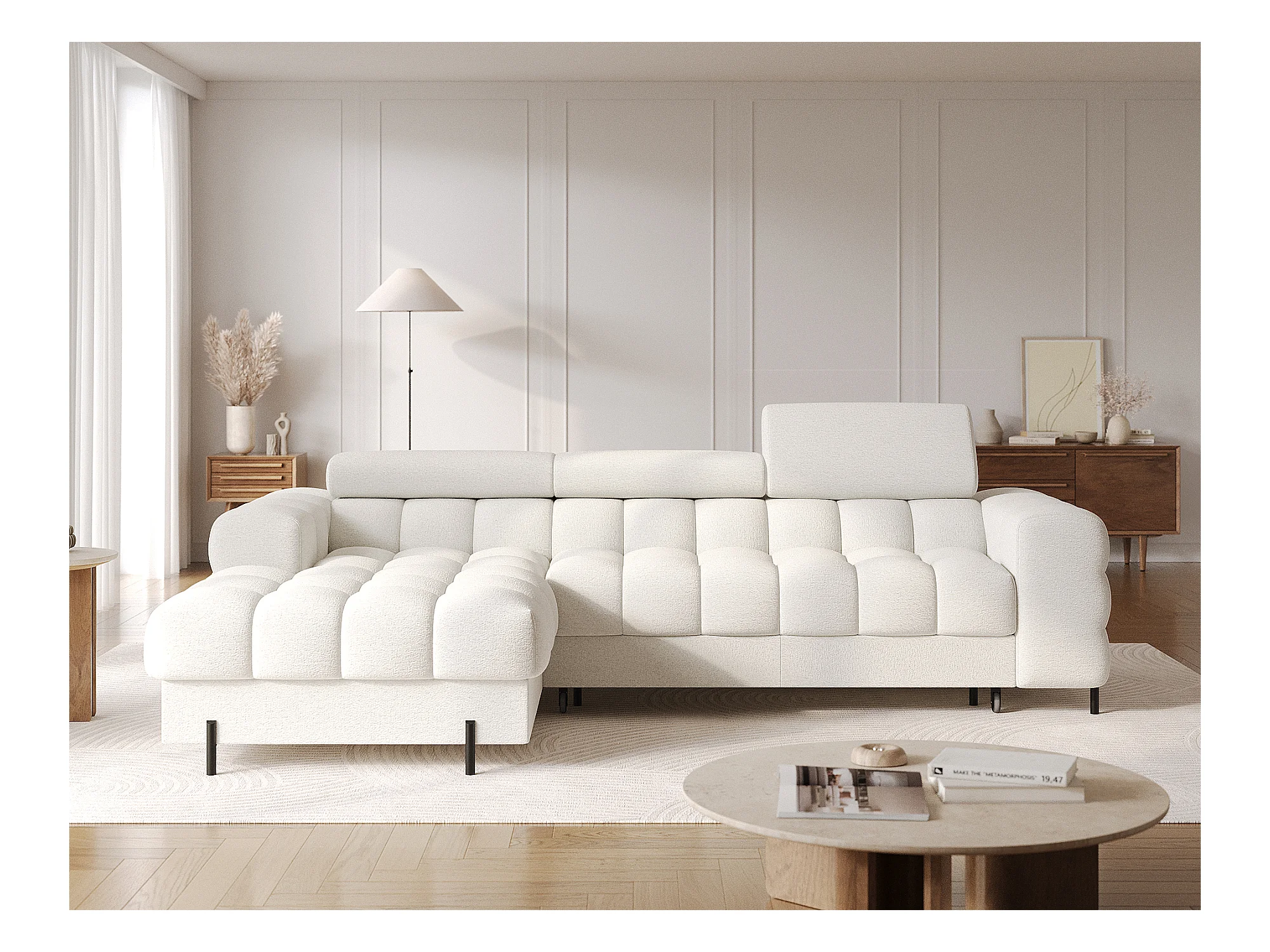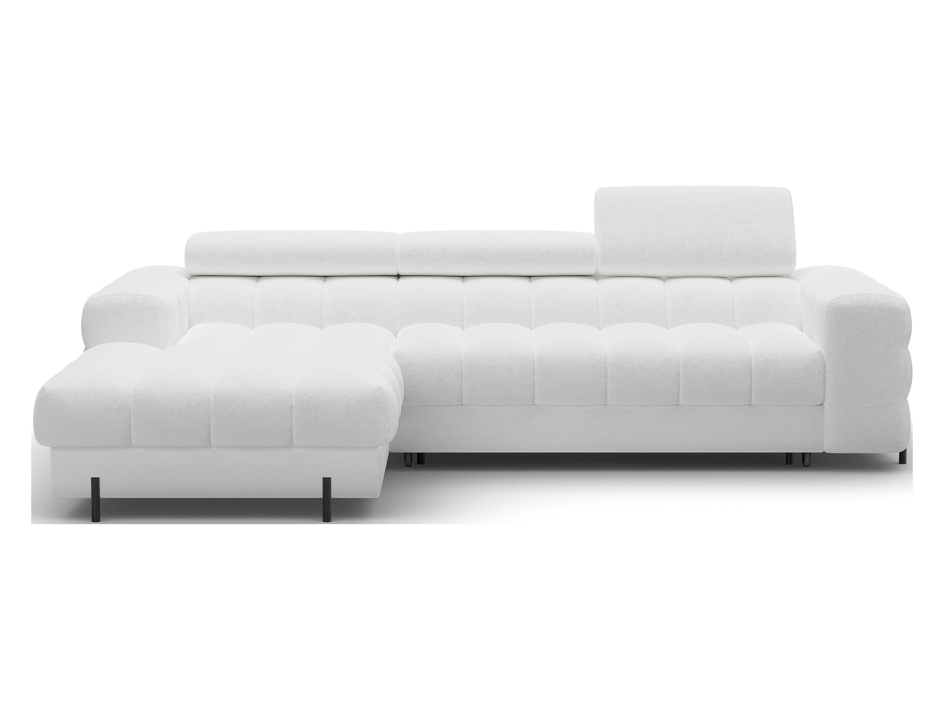 Canapé d’angle convertible tissu appuis-tête réglables KATE – Coffre et pieds métal noir-Blanc-angle gauche
