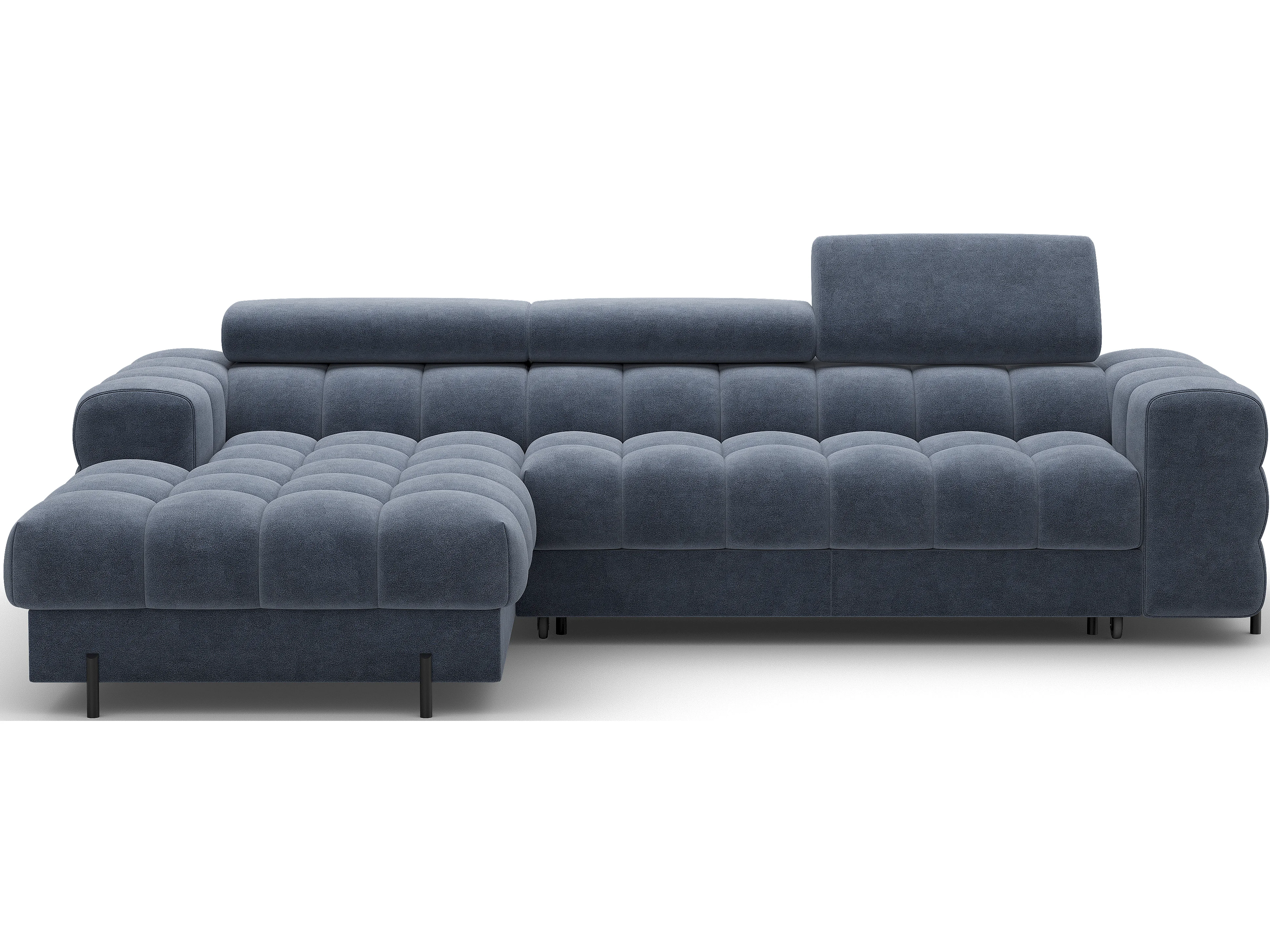 Canapé d’angle convertible velours appuis-tête réglables KATE – Coffre et pieds métal noir-Bleu marine-angle gauche