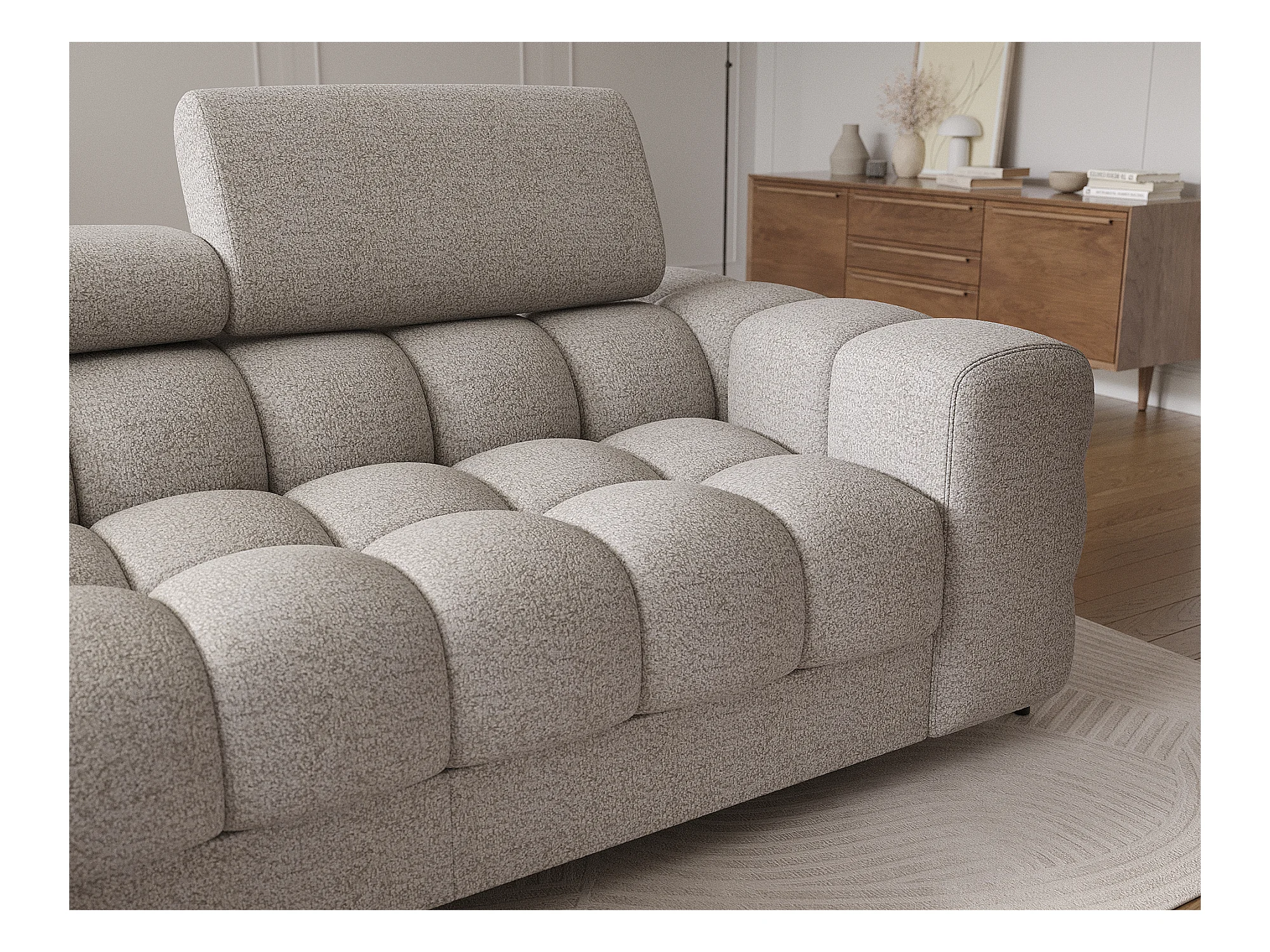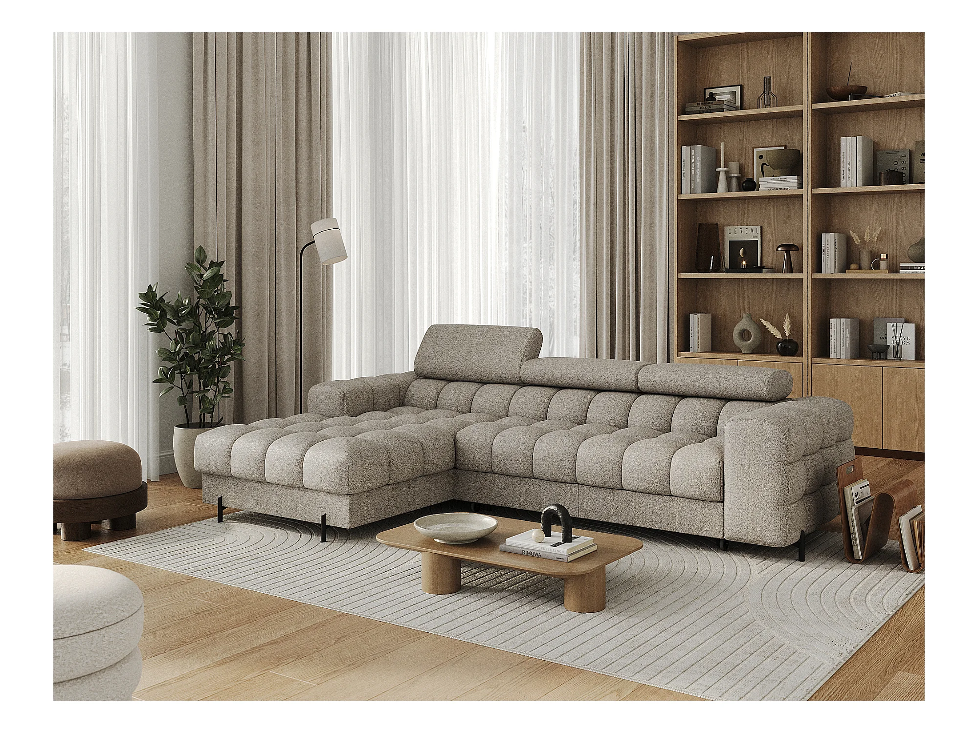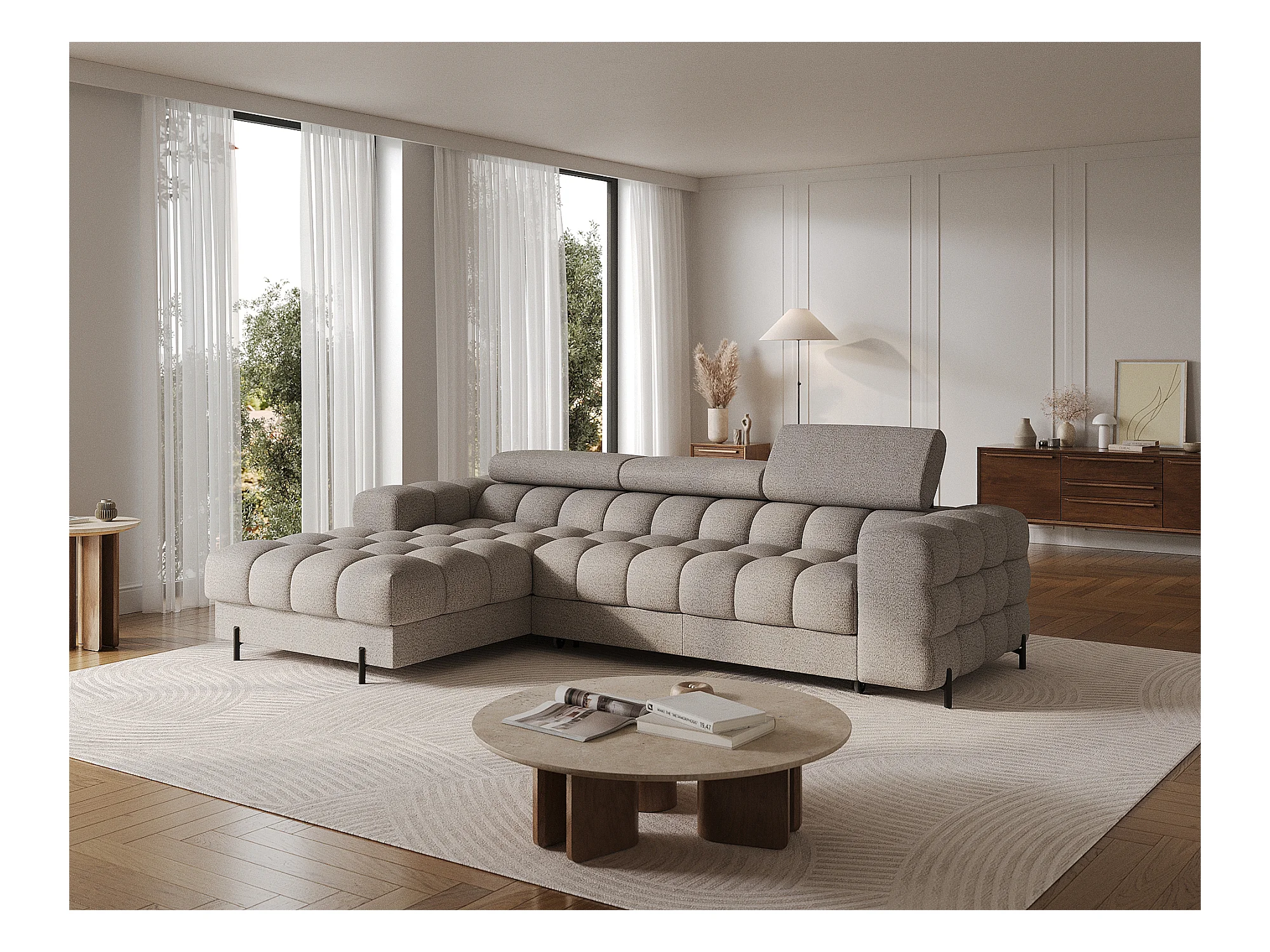 Canapé angle droit convertible tissu beige chiné avec appuis-tête réglables Rikaro 280cm