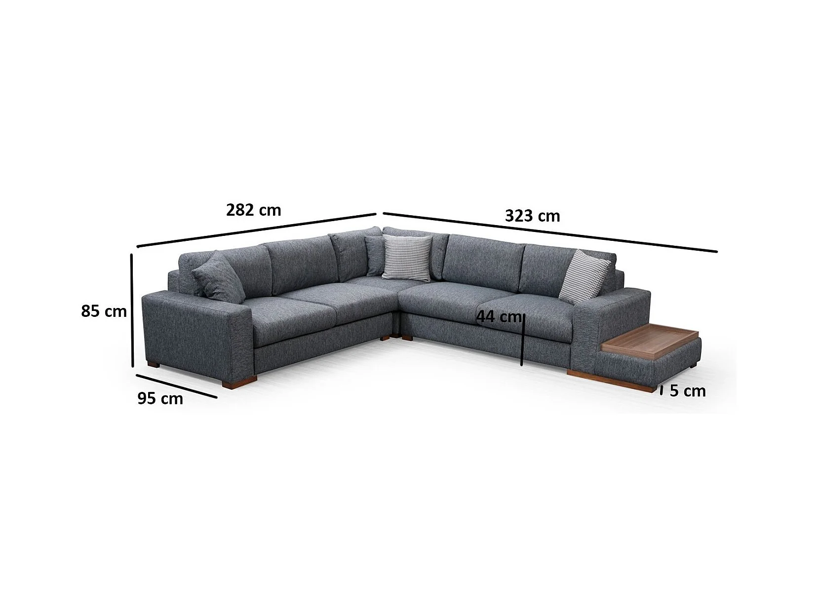 Canapé d'angle tissu anthracite avec étagère en bois sur la droite Kaloé 323cm