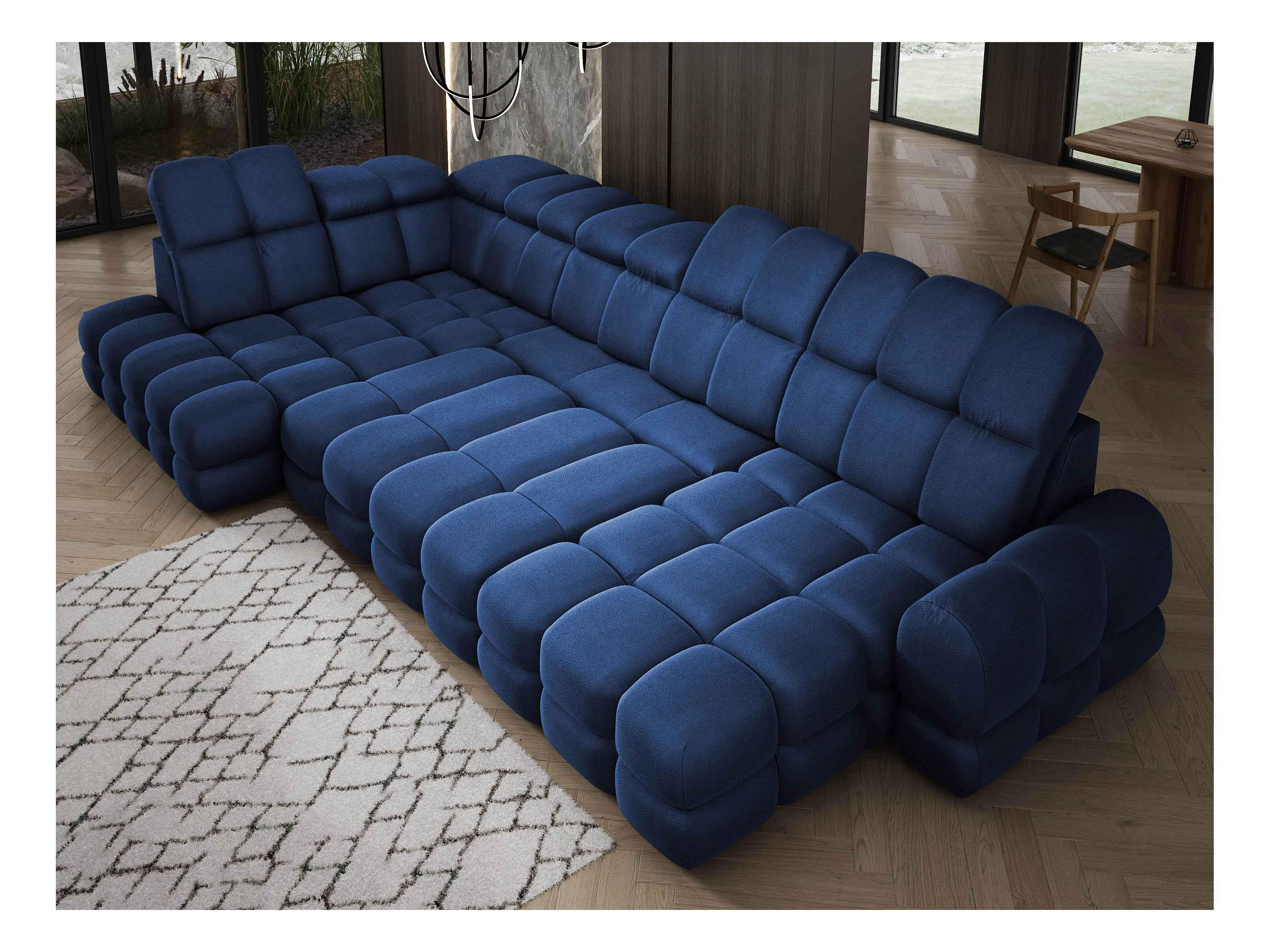 Canapé d’angle Tollo Bleu tissu Solar côté gauche 400x217x105 cm, U-Form avec couchage, coffre 120x85x17 cm, réglable électriquement