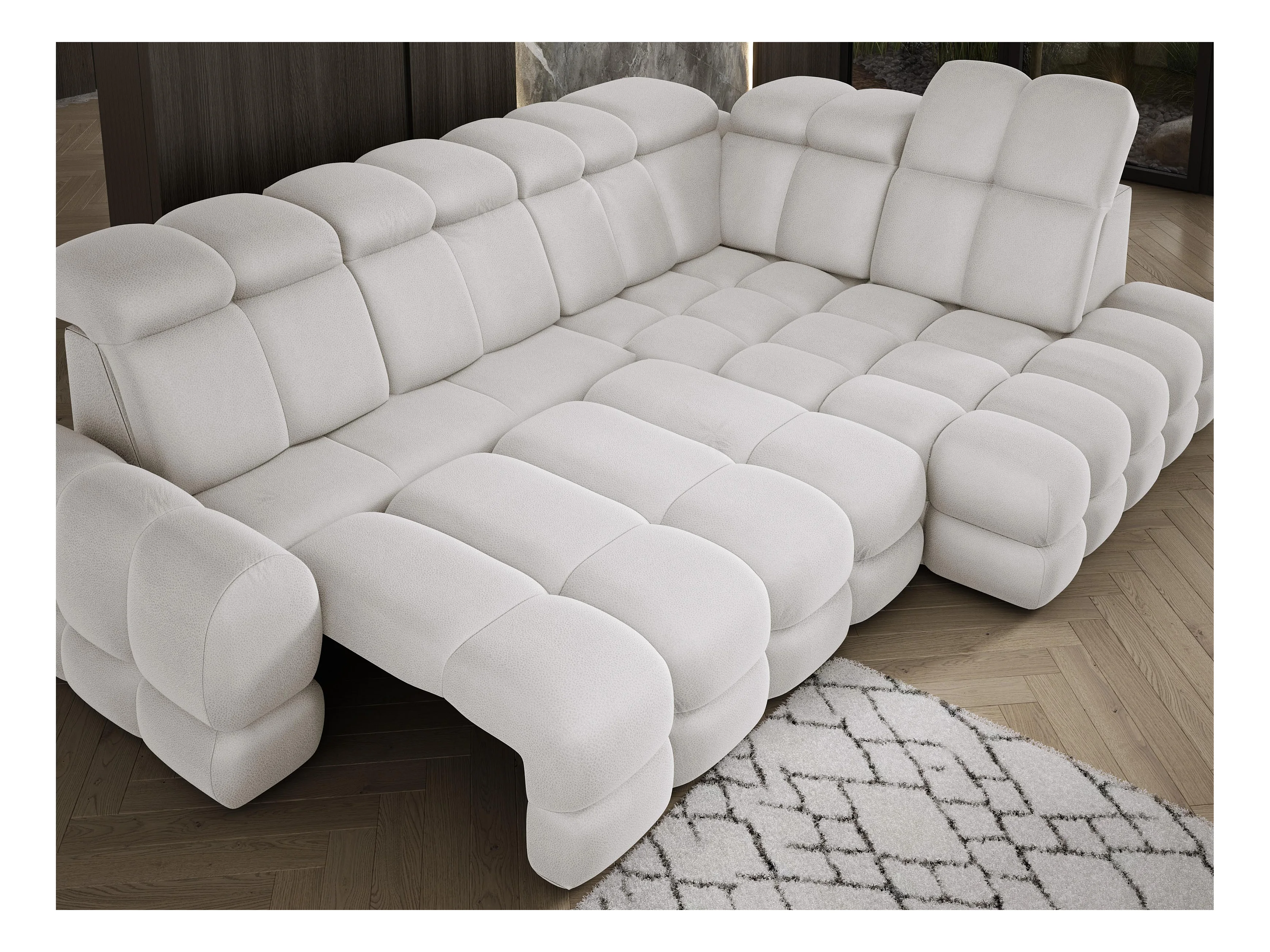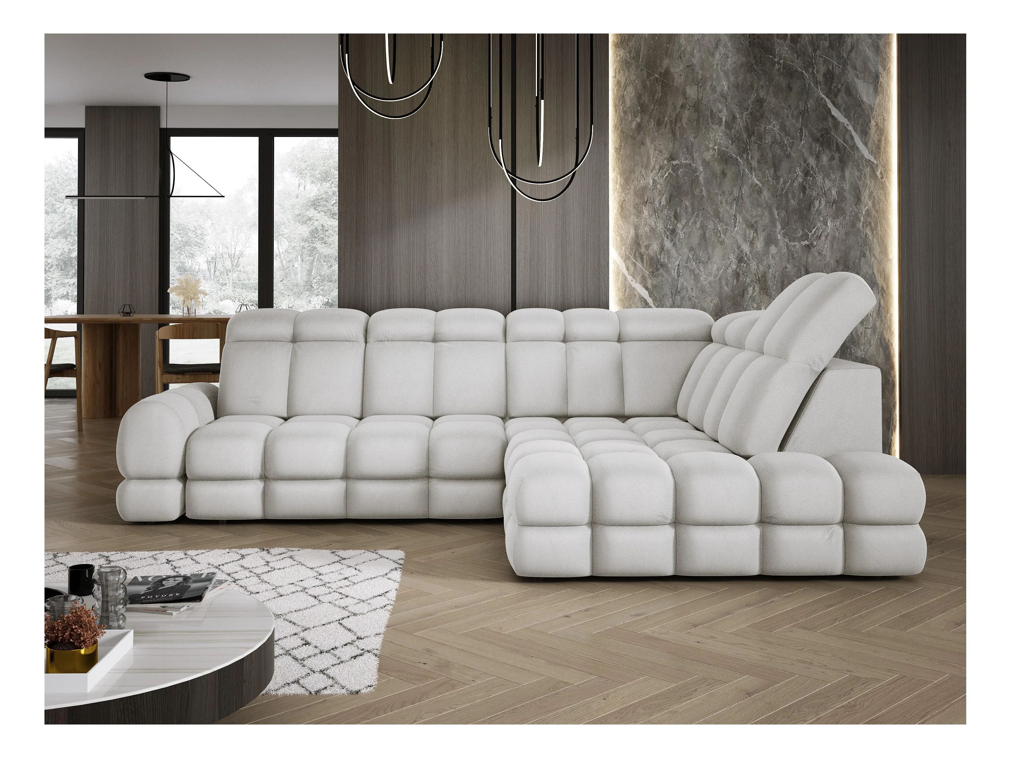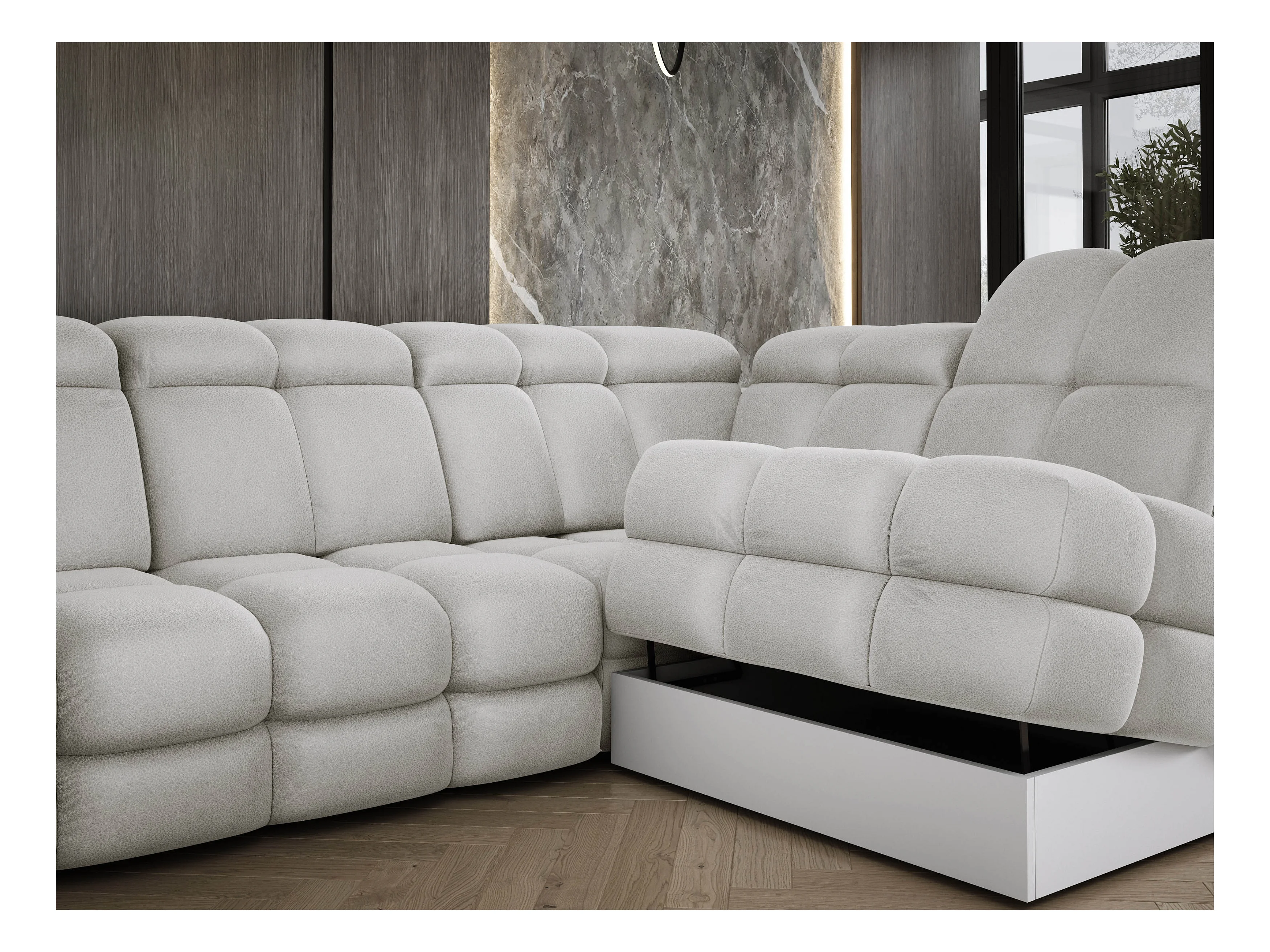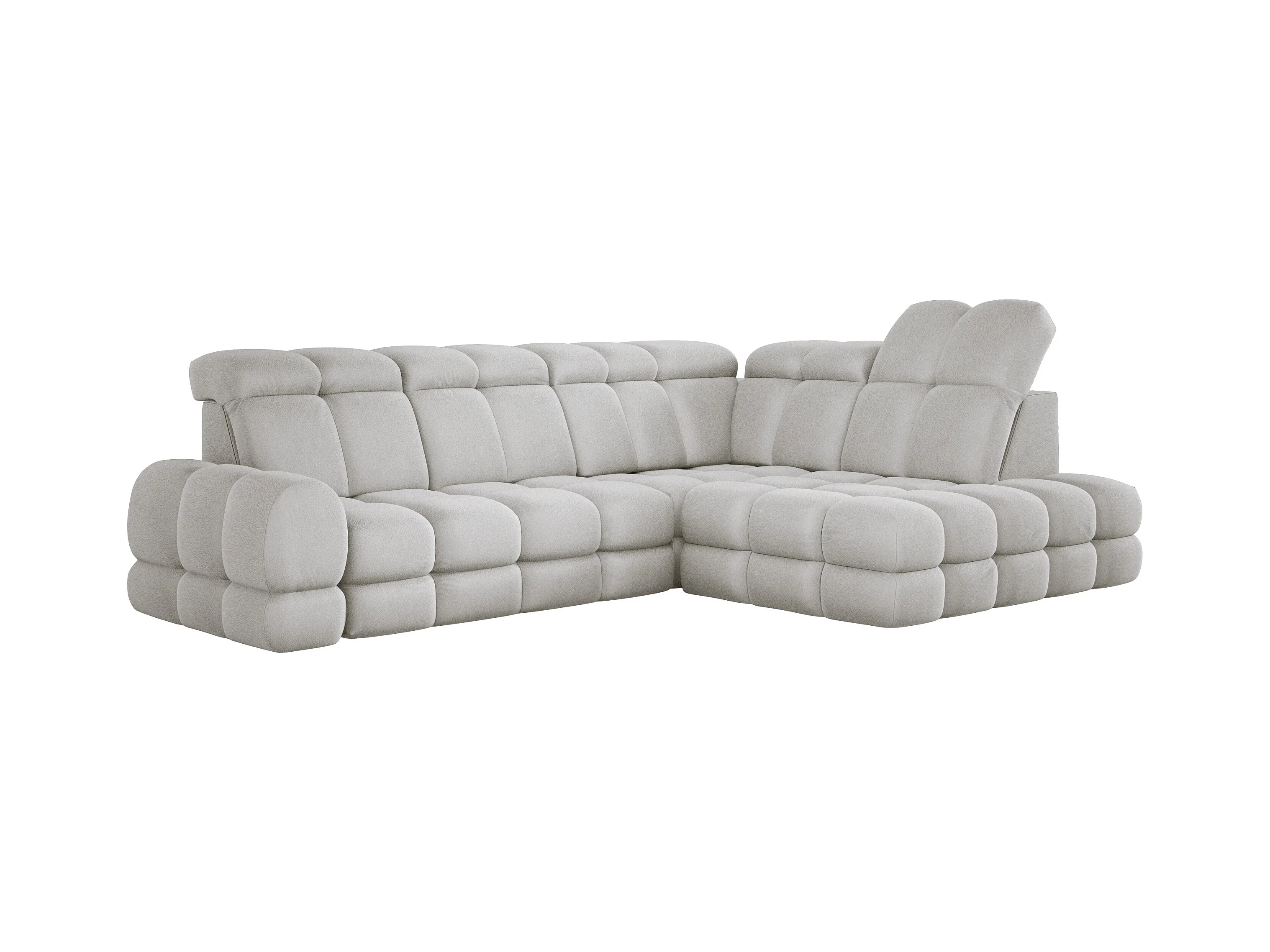 Canapé d'angle Tollo Argent tissu Salvador côté droit 302x217x105 cm, forme L, convertible, coffre 120x85x17 cm, réglage électrique