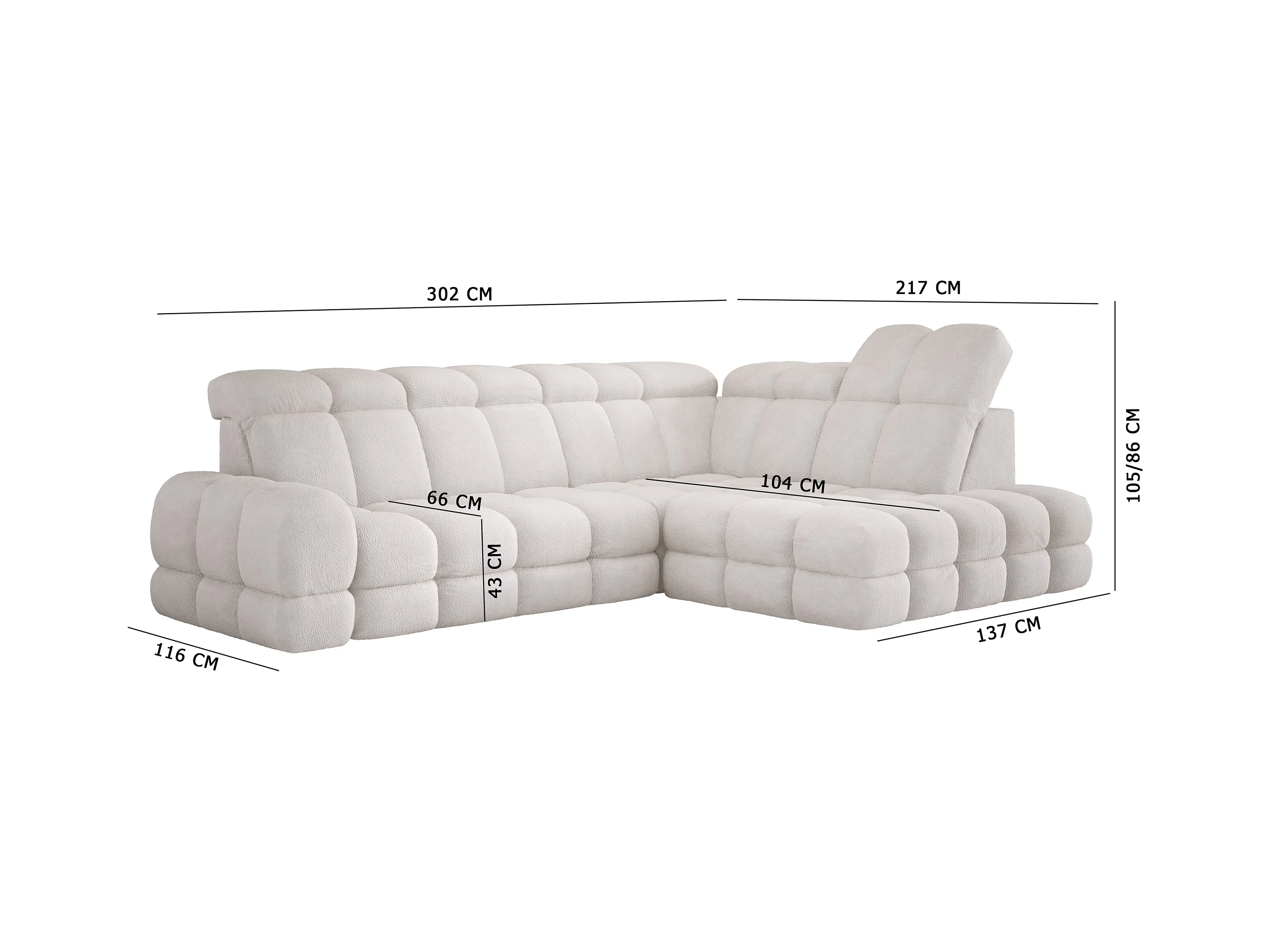 Canapé d'angle RAVEN XL convertible avec tiroir-lit, appuie-têtes réglables, coffre, 334x198x162cm, côté droit Crème