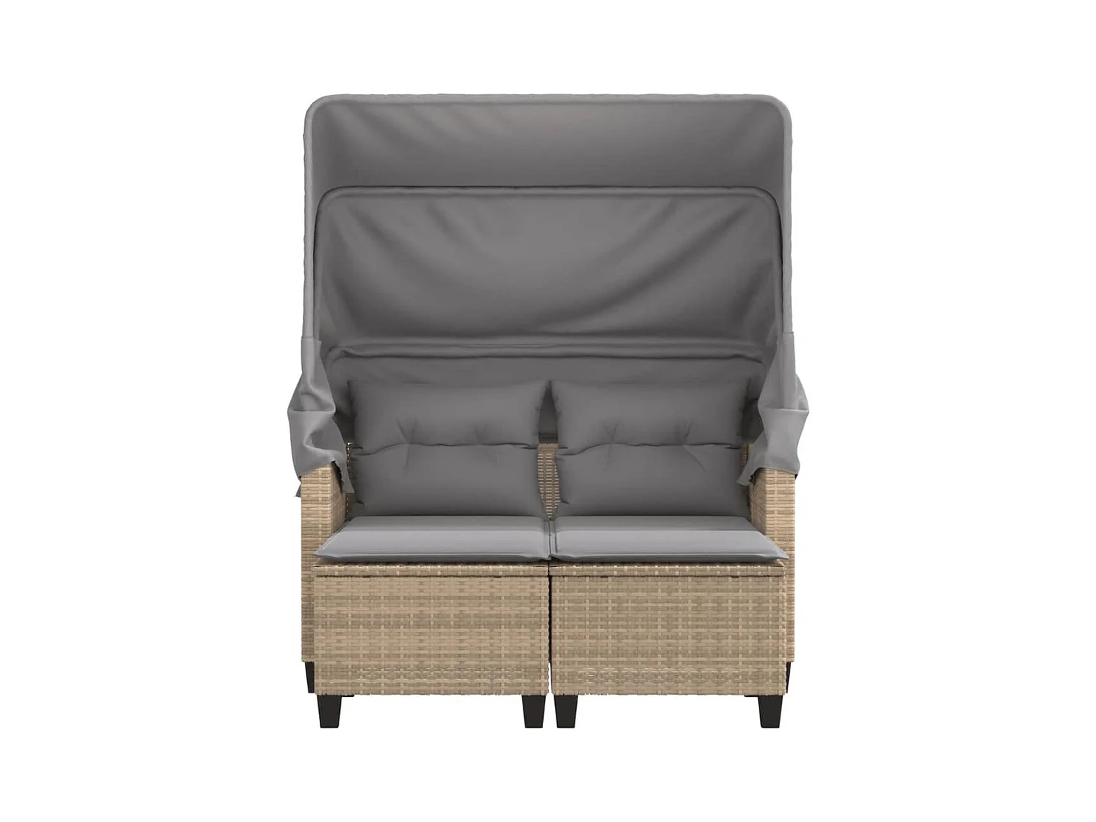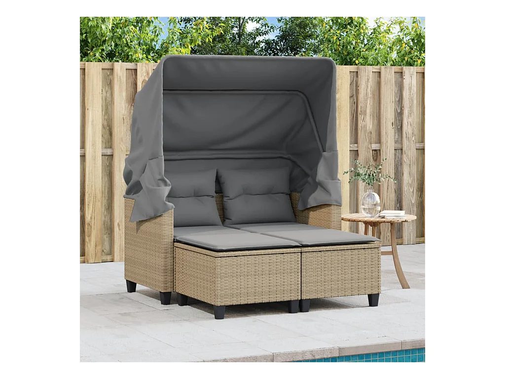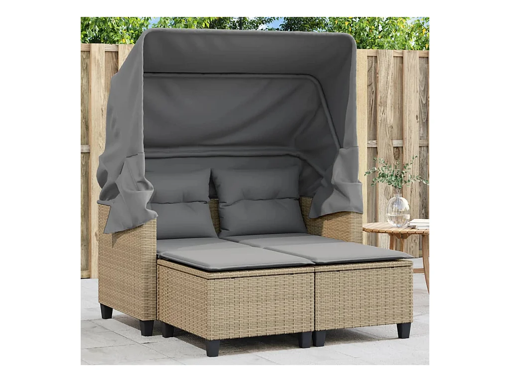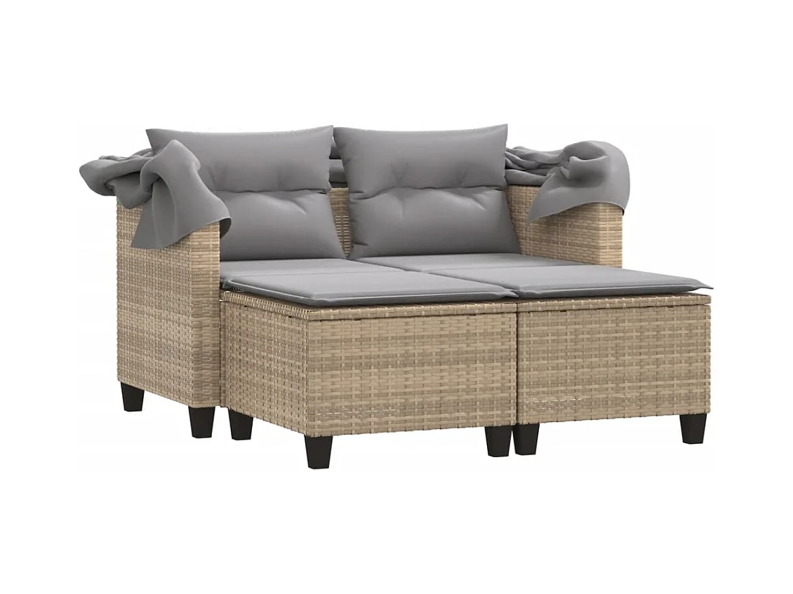 Canapé de jardin 2 places avec auvent et tabourets beige rotin