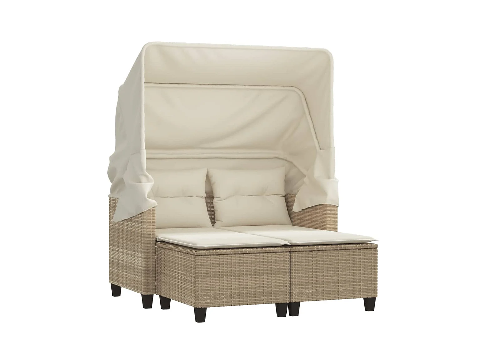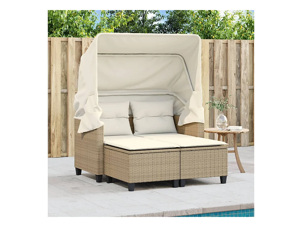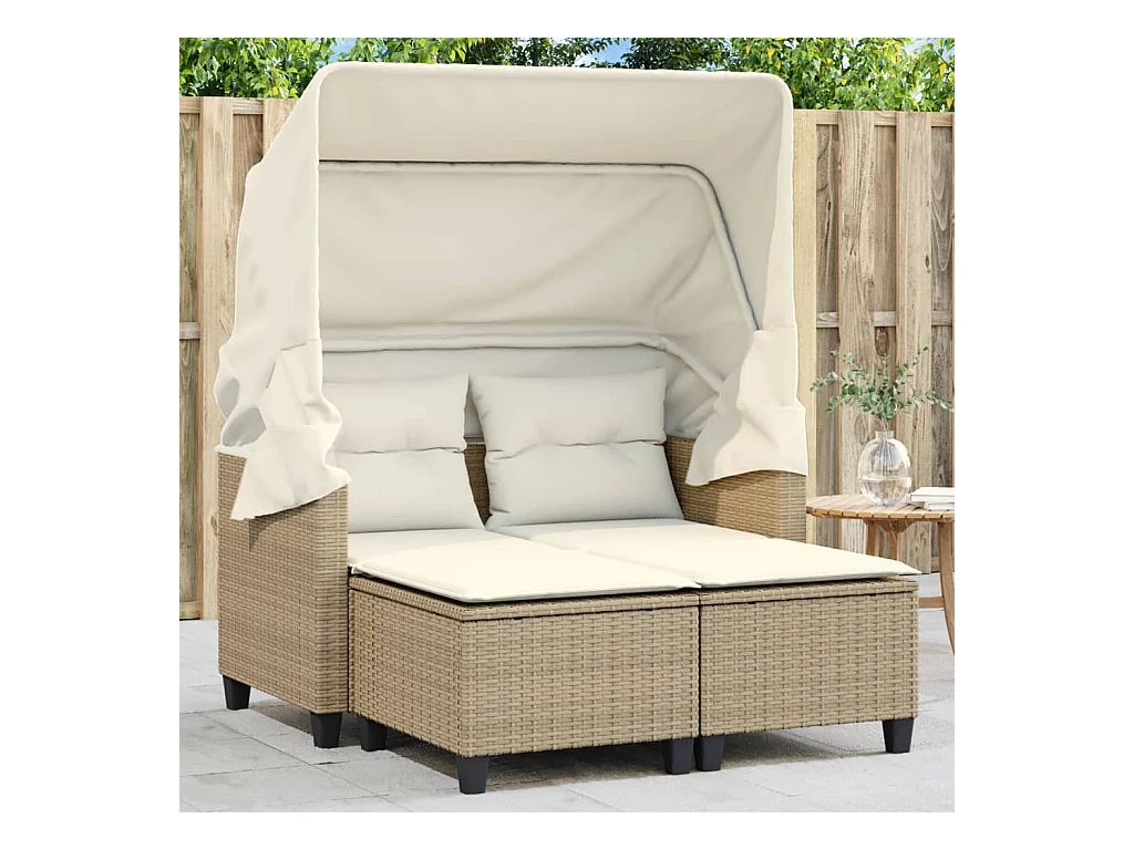 Canapé de jardin 2 places avec auvent et tabourets beige rotin