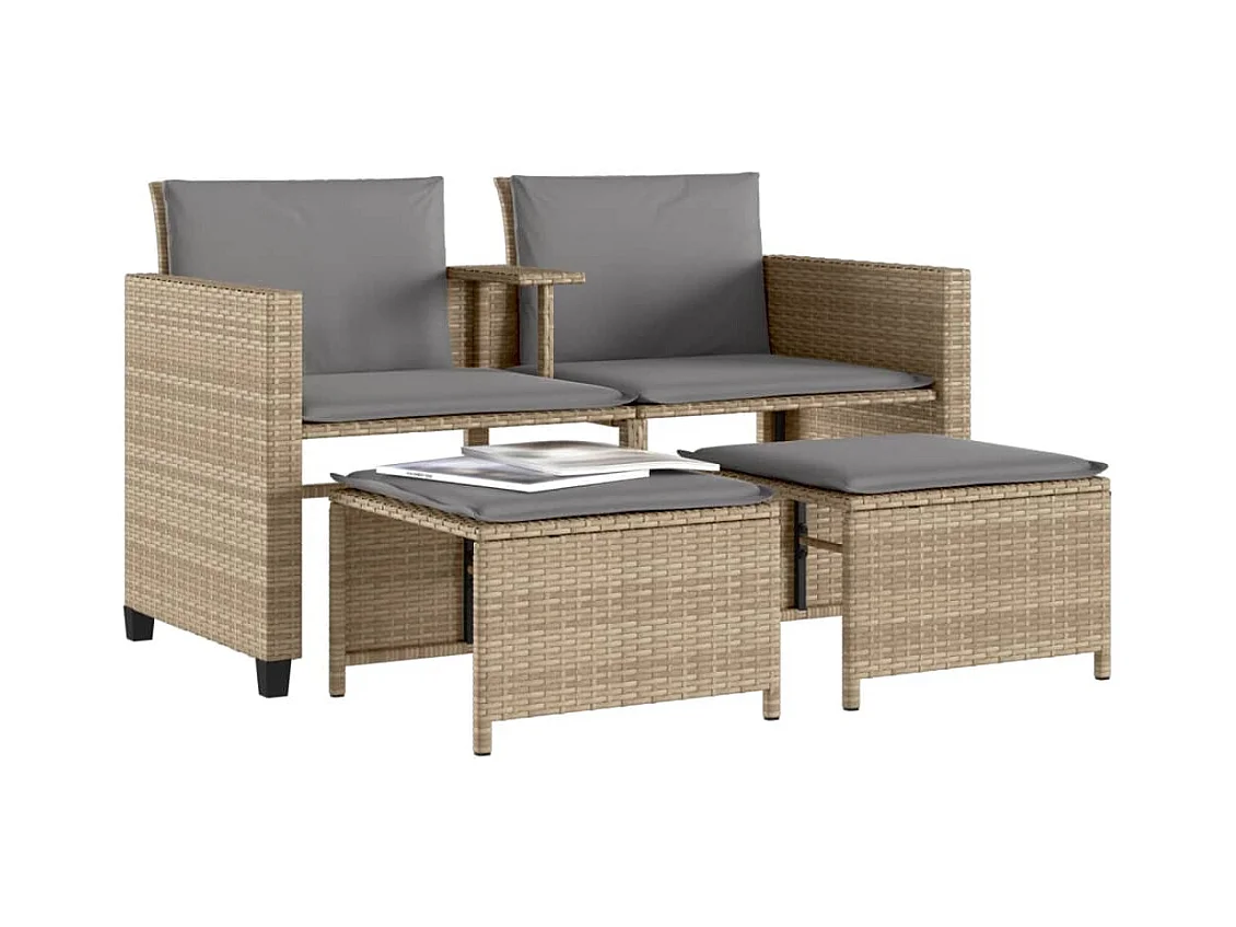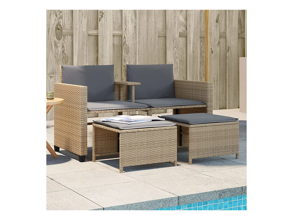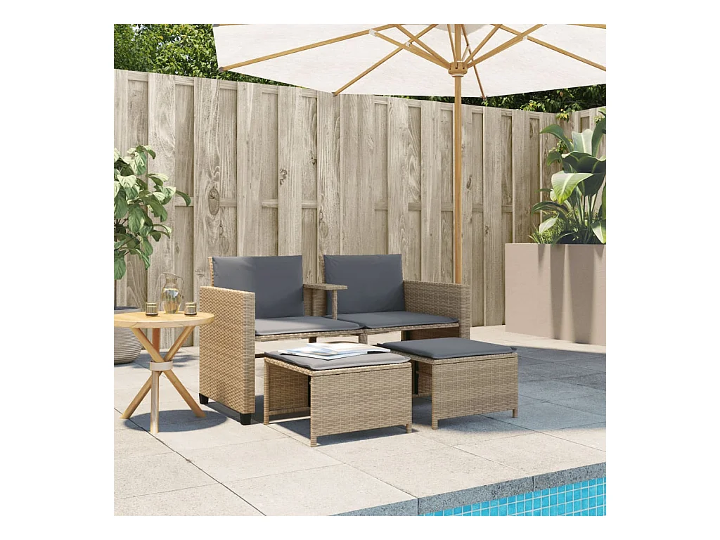 Canapé de jardin 2 places avec table et tabourets beige rotin