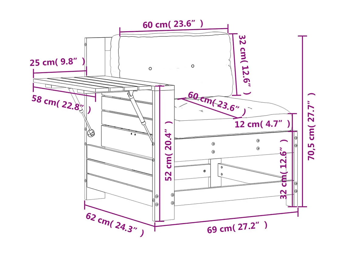 Canapé de jardin accoudoir avec table d'appoint bois massif pin