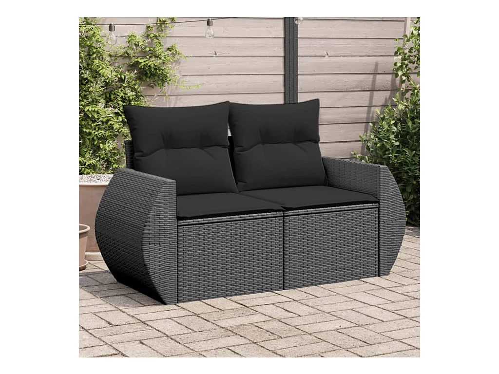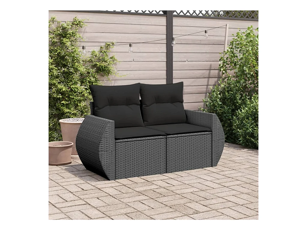 Canapé de jardin avec coussins 2 places noir résine tressée