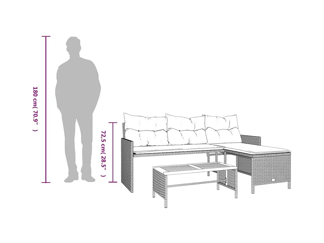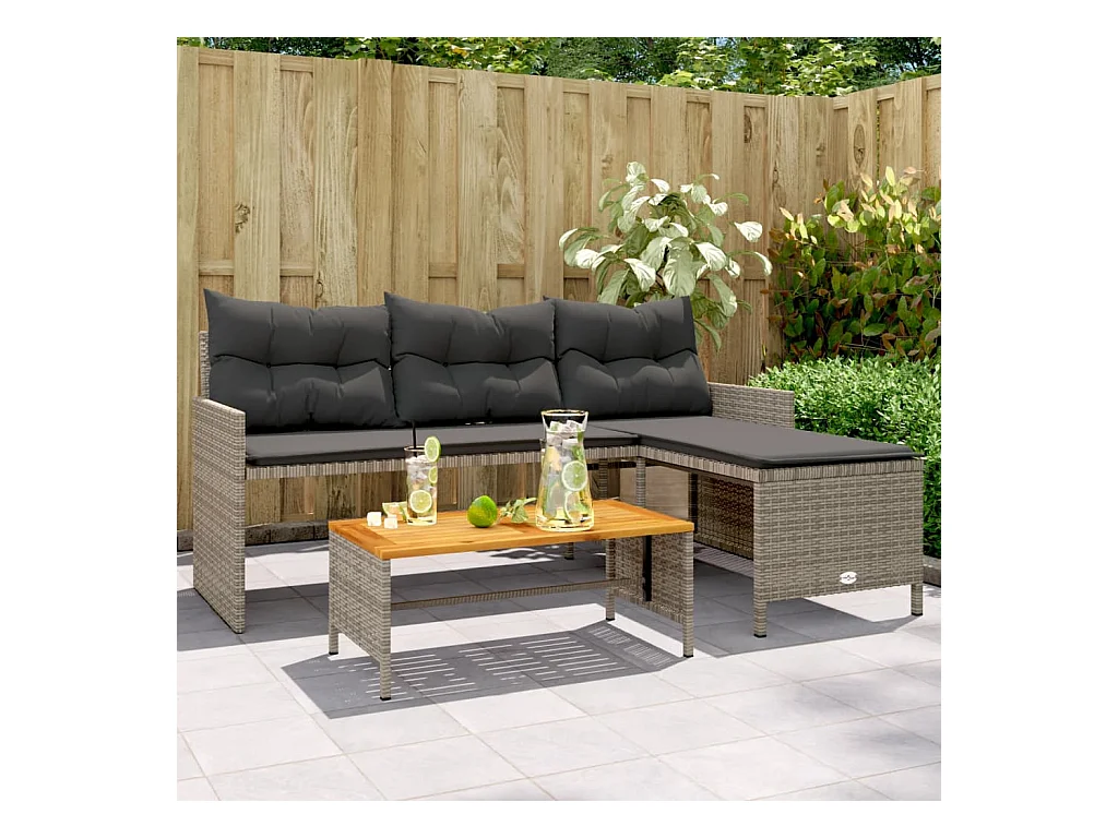 Canapé de jardin en forme de L et coussins gris résine tressée