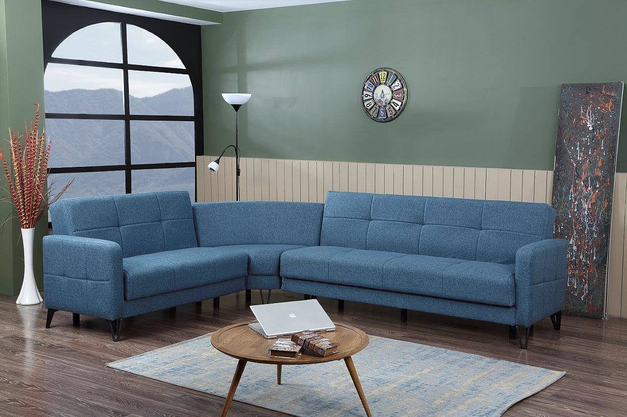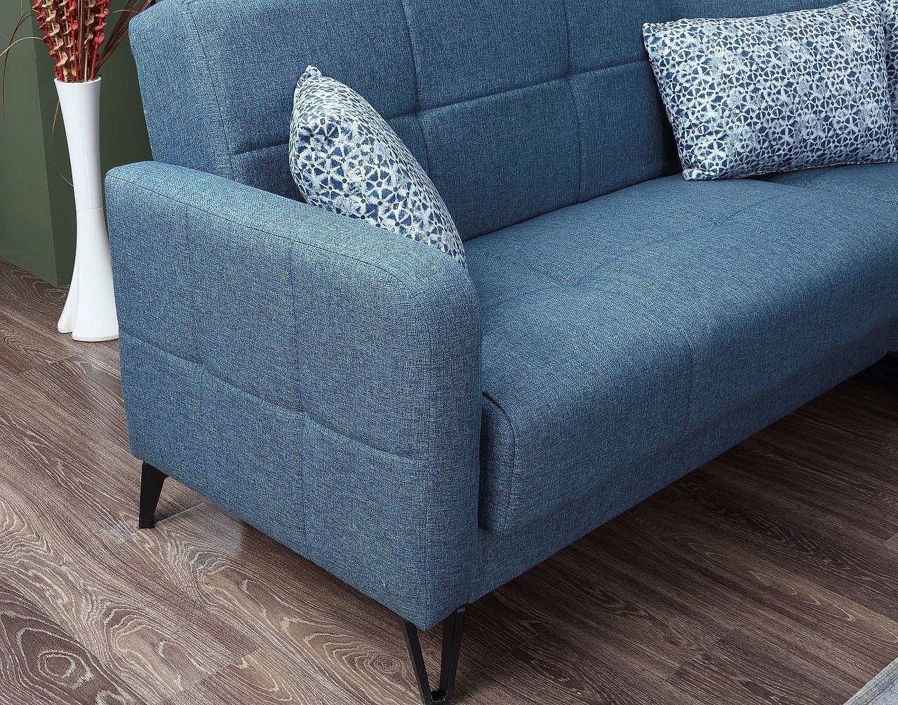Canapé Miguel, Canapé d'angle rangement avec 3 coussins inclus, Canapé en tissu rembourré avec ouverture clic-clac, avec péninsule réversible, 225x151h84 cm, Bleu