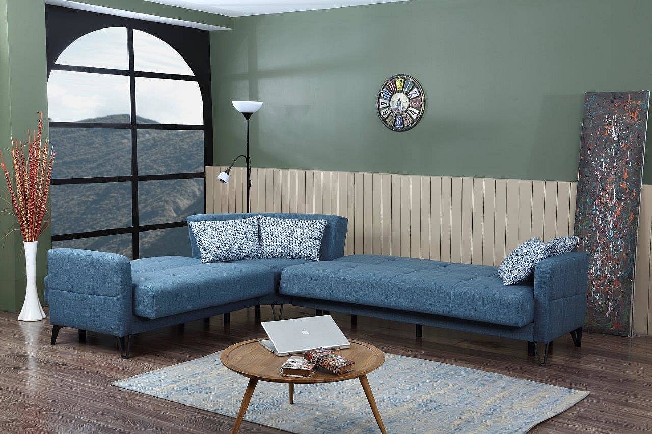 Divano letto con penisola Apo, Divano letto contenitore reversibile con 4 cuscini, Sofà in tessuto con apertura click-clack, 302x234h88 cm, Blu