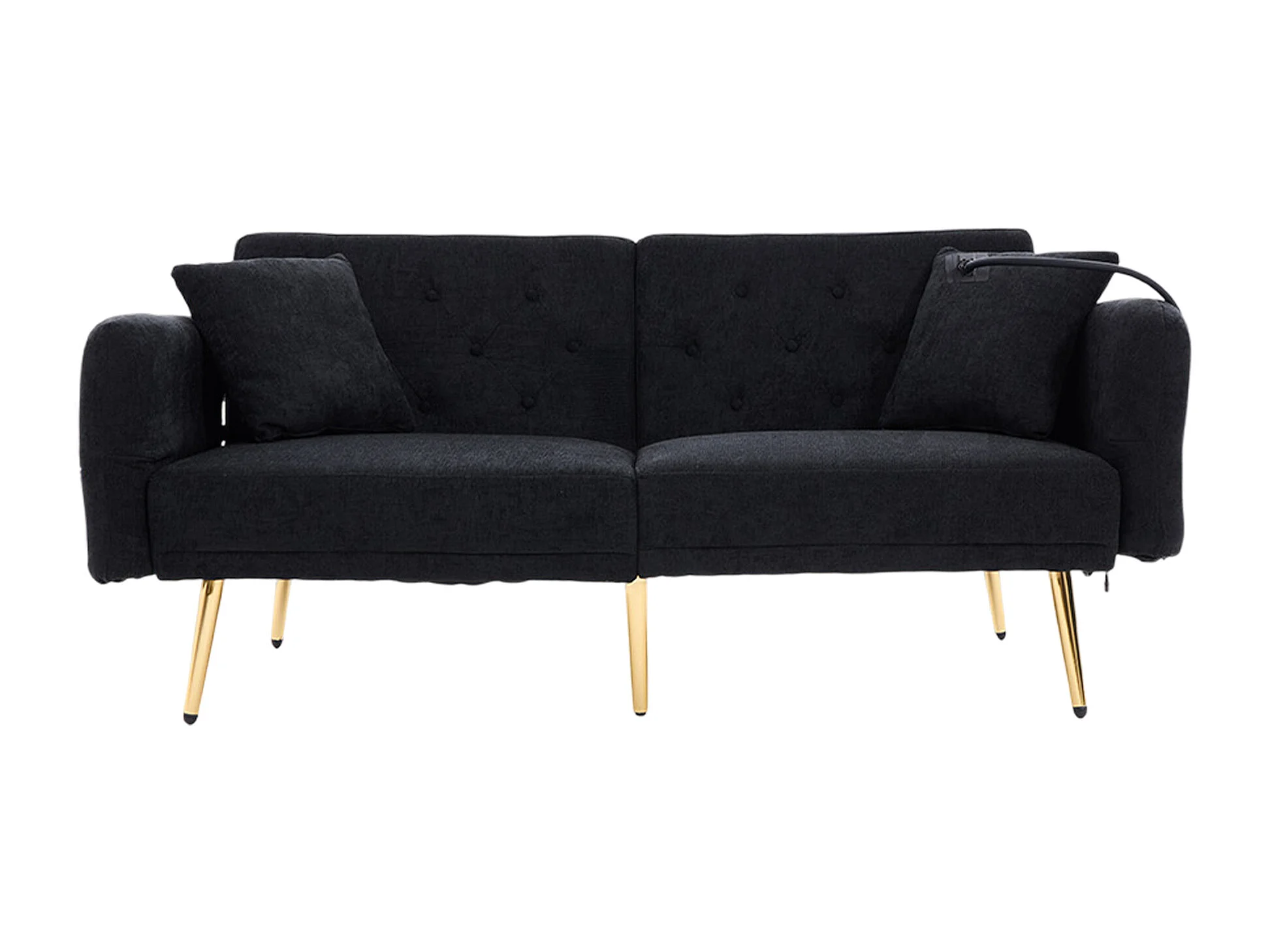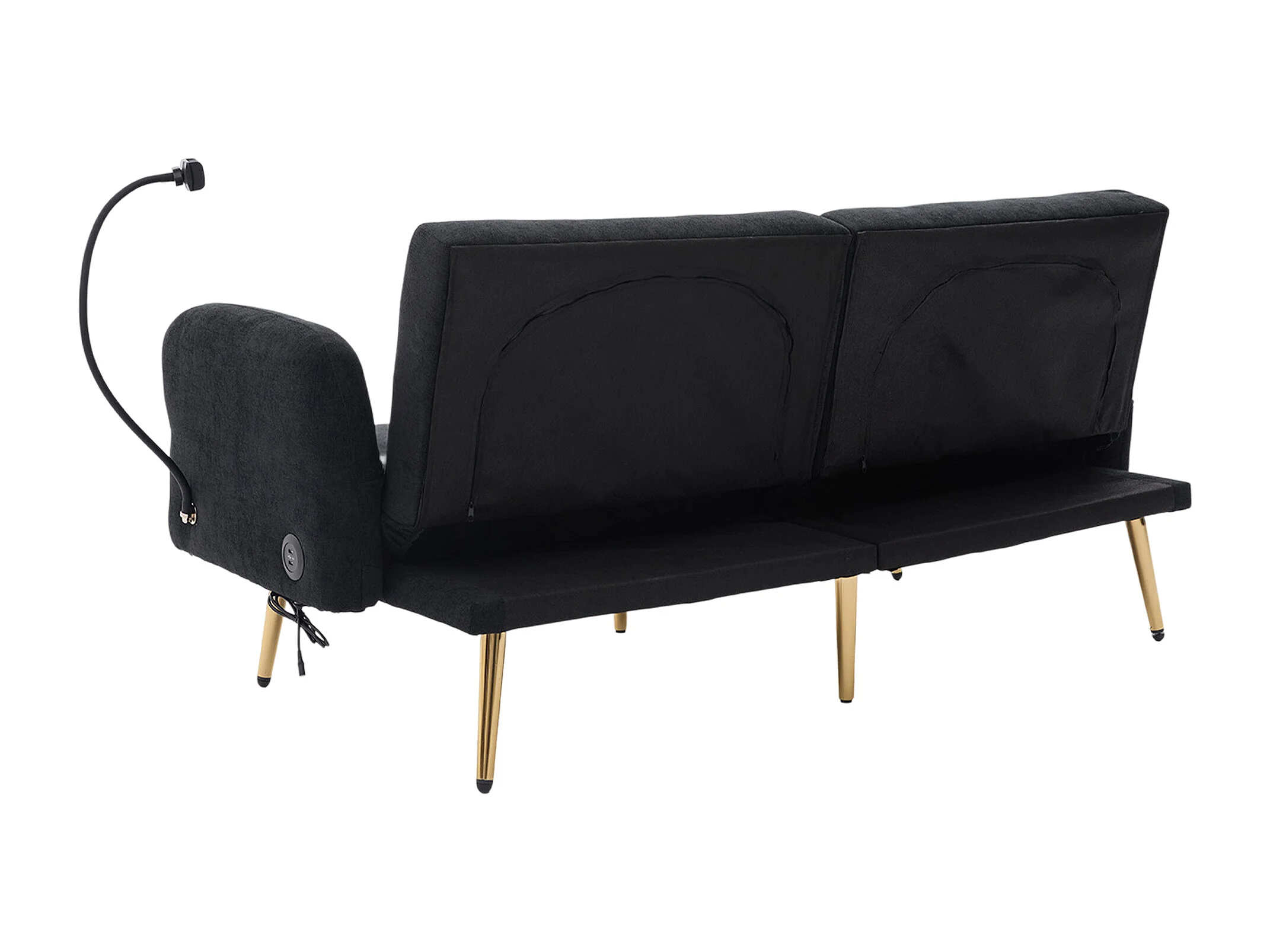 Canapé convertible 2 places 173x78x78 cm, dossier réglable, 2 ports USB, porte téléphone, pochette, chenille noir