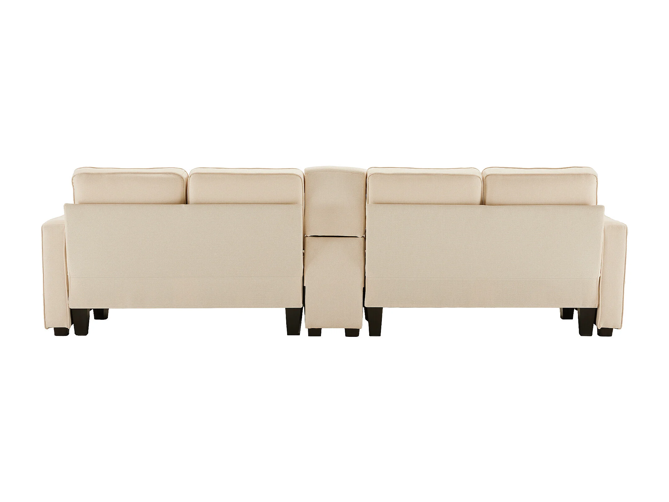 Canapé 4 places 290x83x88 cm, console avec 2 porte gobelets et 2 ports USB, poches d'accoudoirs, tissu en lin beige