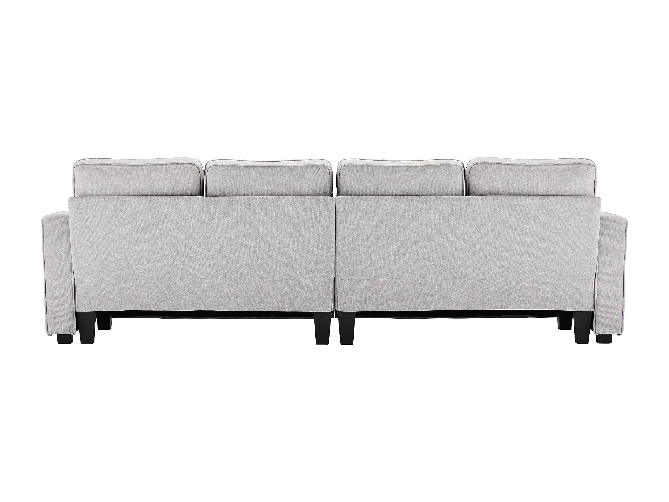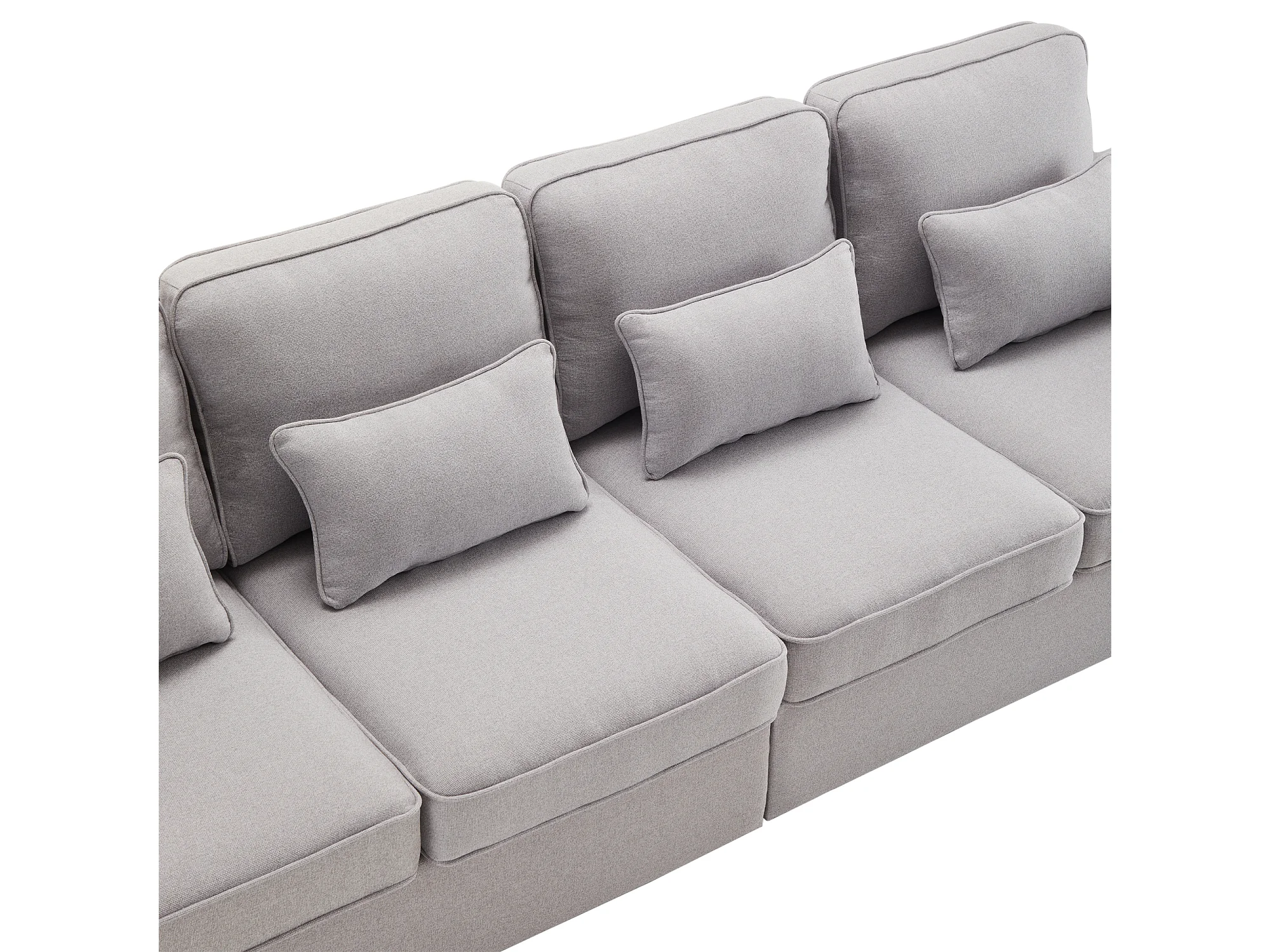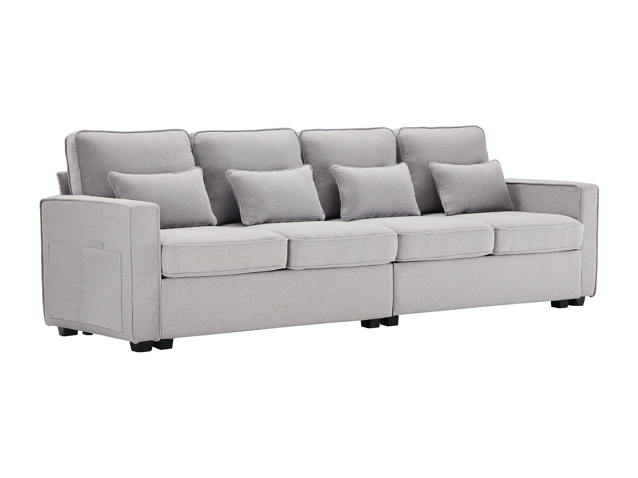 Canapé 4 places moderne en lin gris clair avec poches latérales et 4 coussins – pour salon, bureau ou appartement