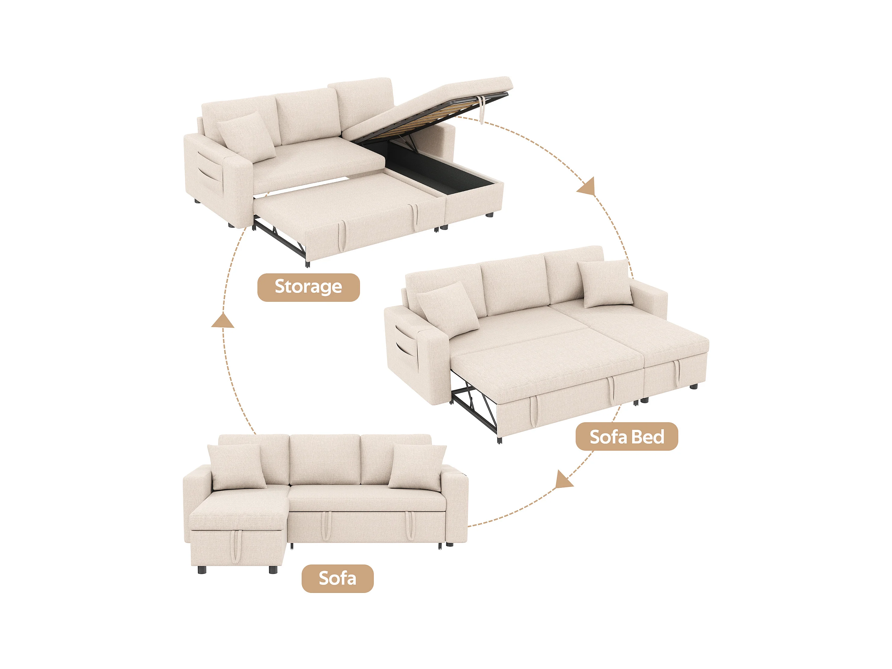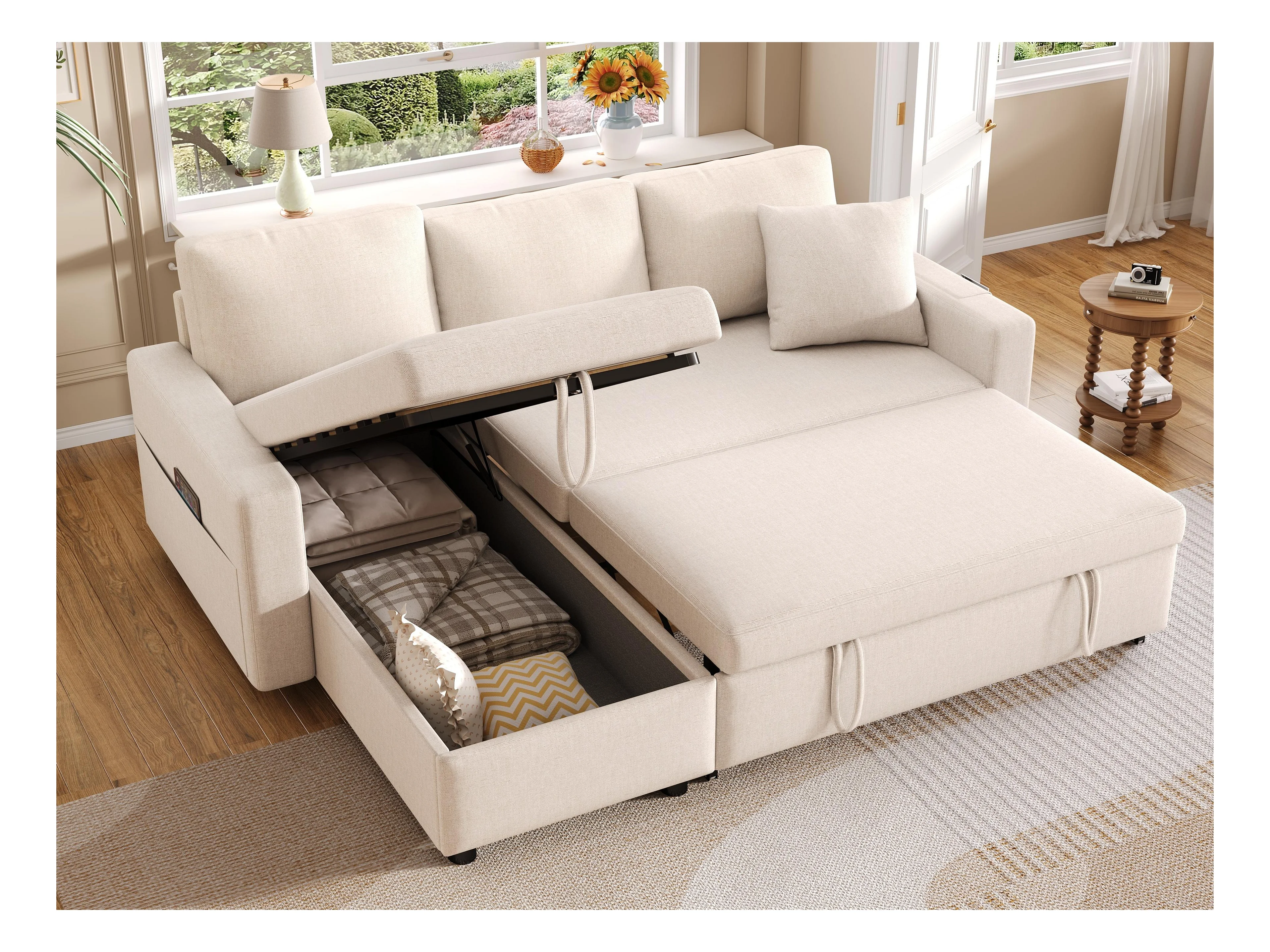 Canapé 3 places convertible - en coton - avec coffre et porte-gobelet - Beige
