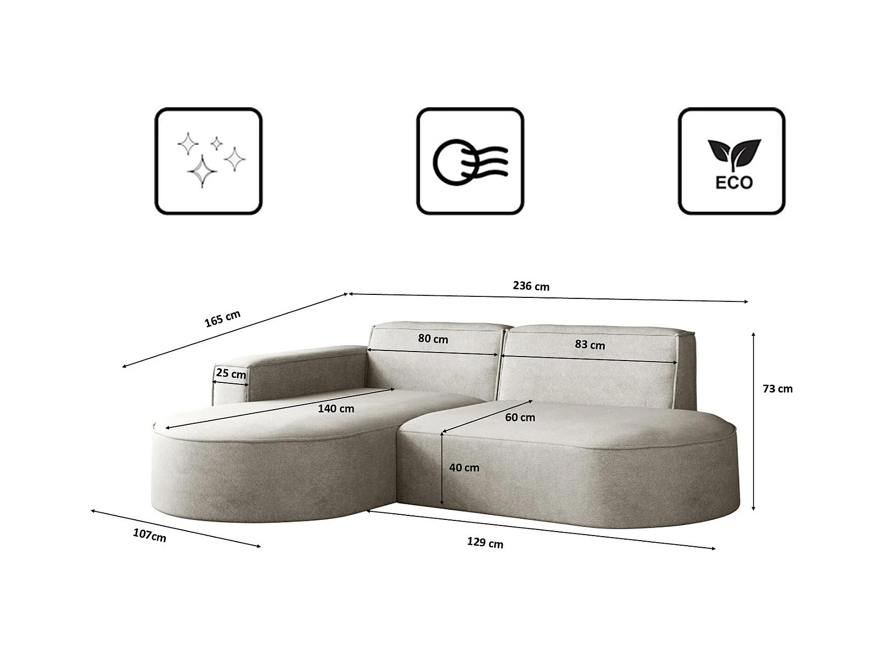 Canapé d'angle en L PULA, tissu Gobi, gris, gauche
