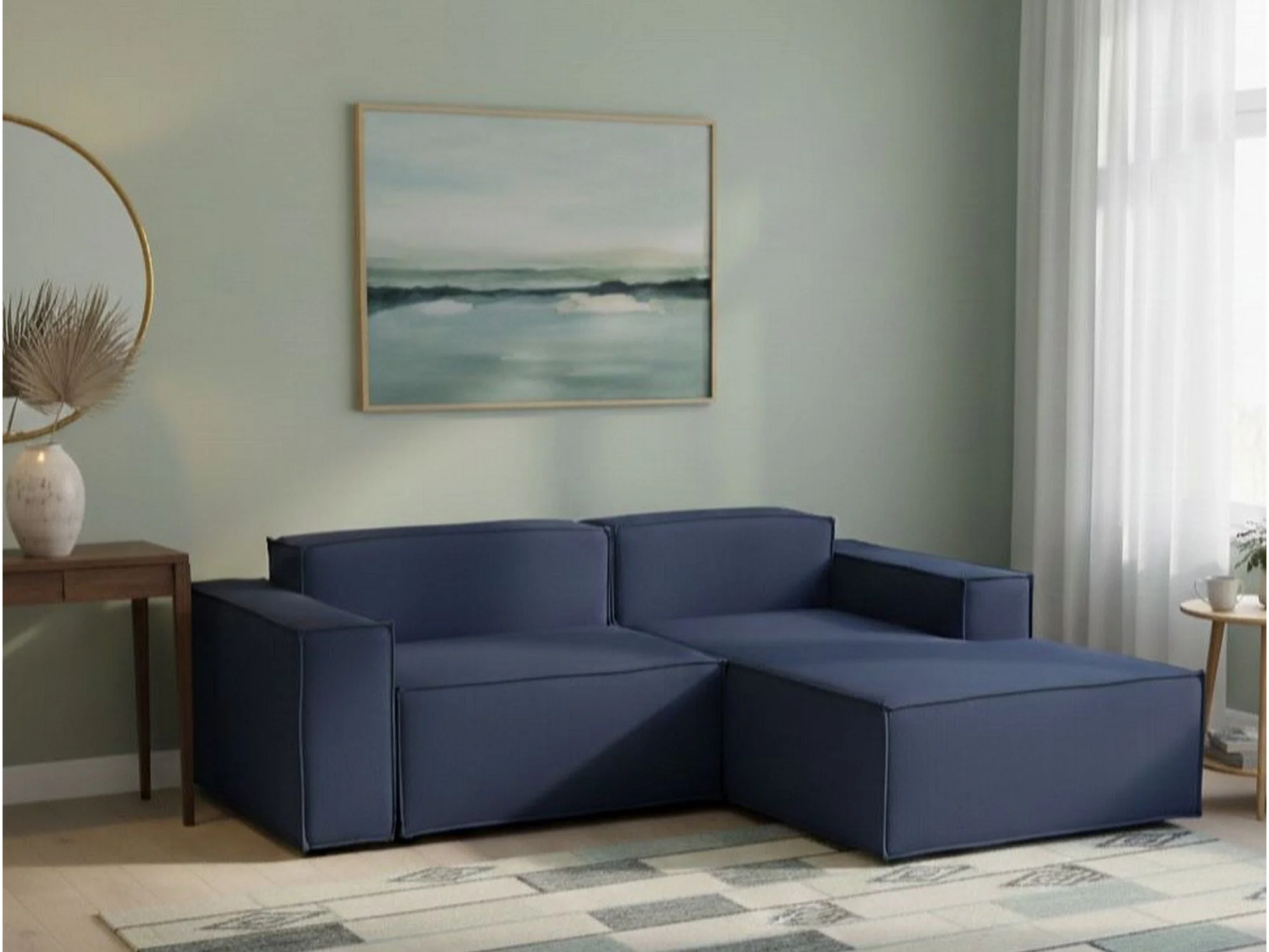 Canapé fixe Dgatta, Grand canapé modulable 2 places avec péninsule droite, 100% Made in Italy, Canapé moderne en tissu, 240x170h70 cm, Bleu