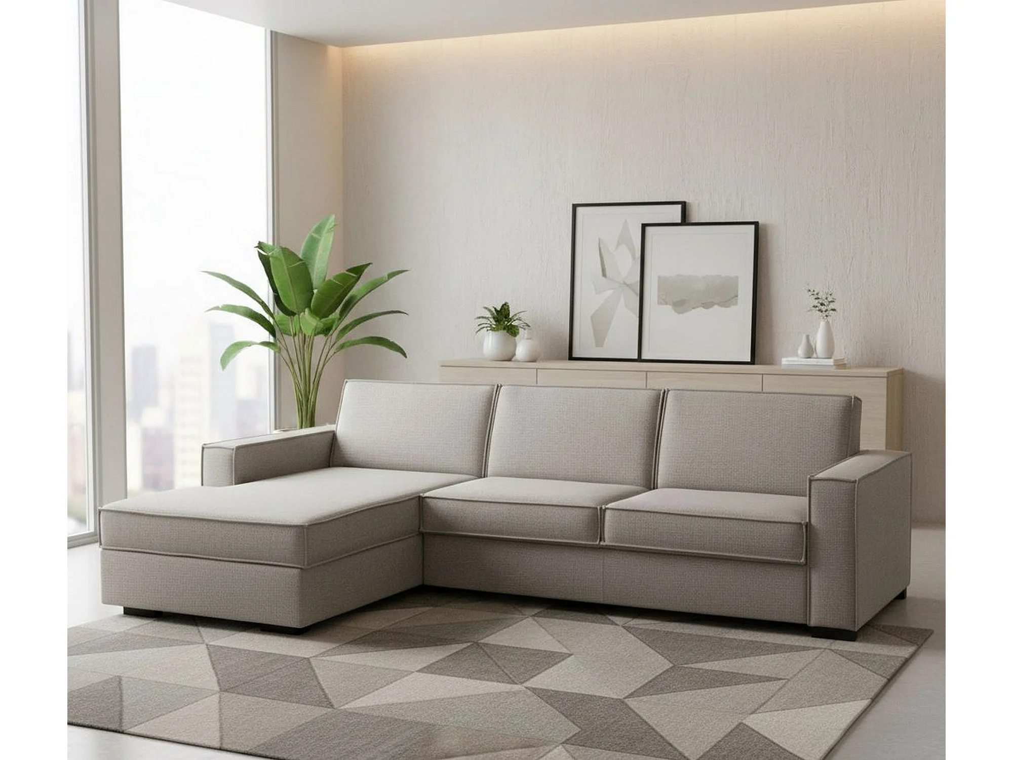 Canapé fixe Dlovis, Canapé d'angle, 100% Made in Italy, Canapé de salon avec, Péninsule conteneur gauche, avec accoudoirs fins, Cm 260x95h90, Taupe