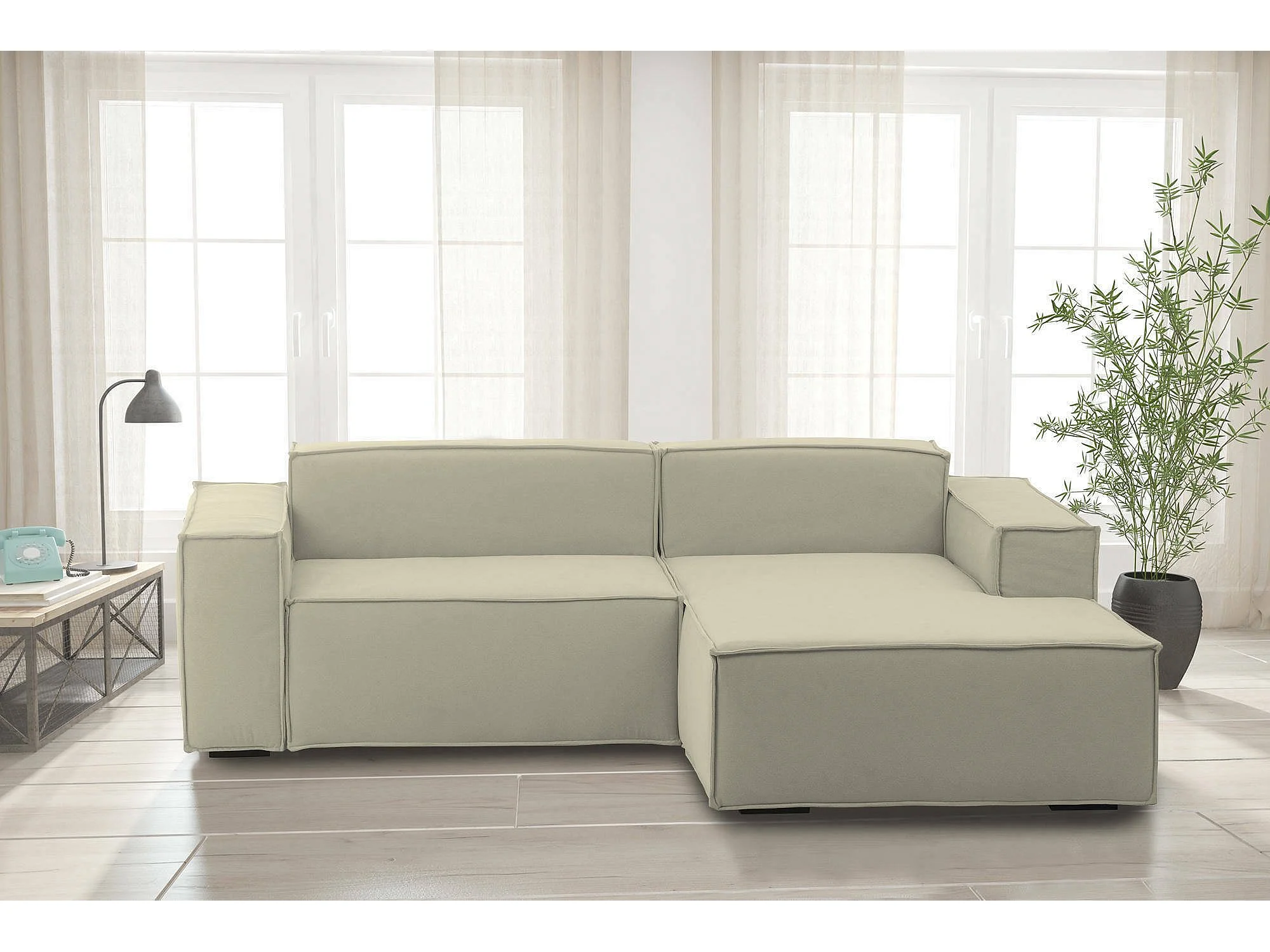 Canapé fixe Lidia, Grand canapé modulable 2 places avec péninsule droite, 100% Made in Italy, Canapé moderne en tissu, 240x170h70 cm, Beige