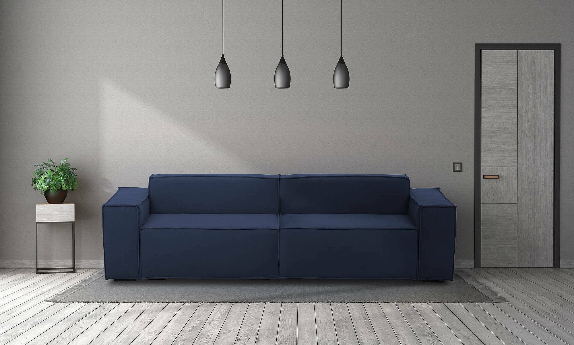 Canapé droit design 2-3 places tissu doux bleu foncé Torpille 195cm