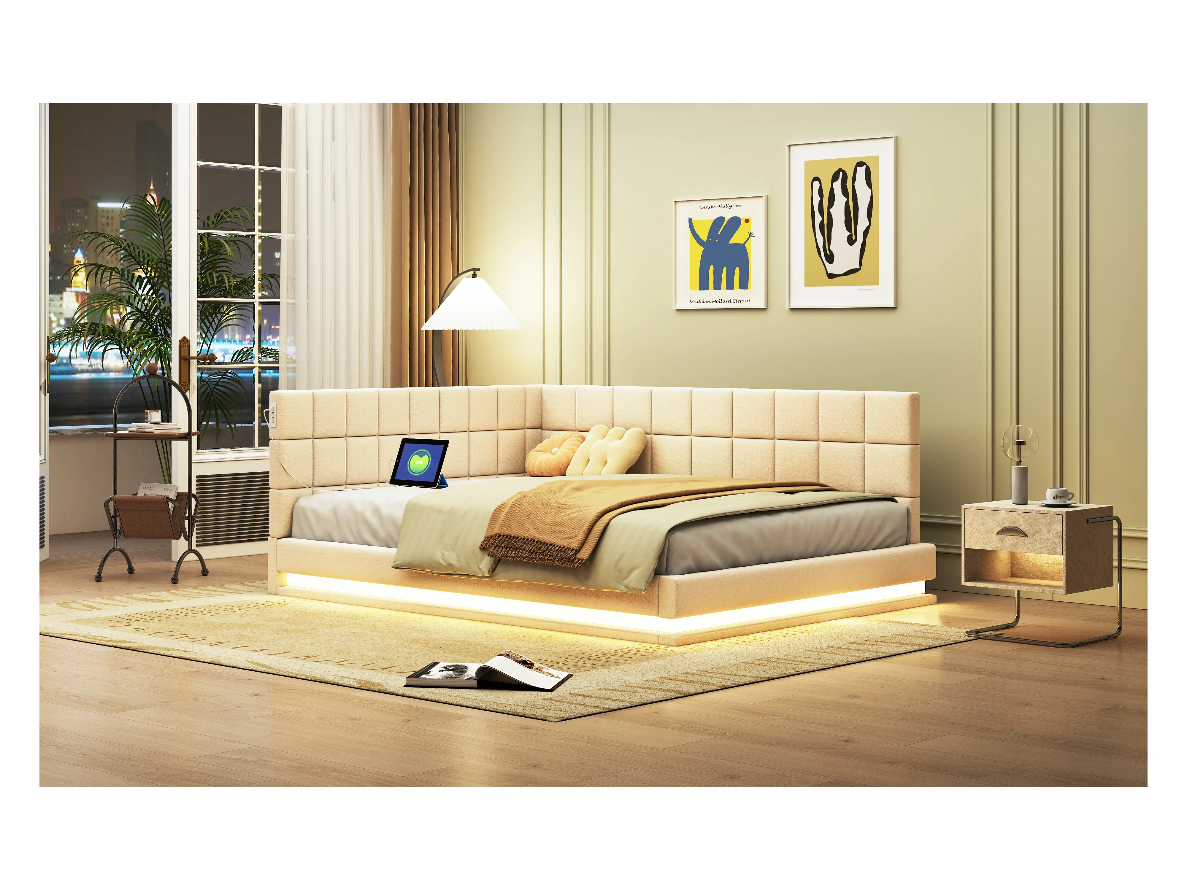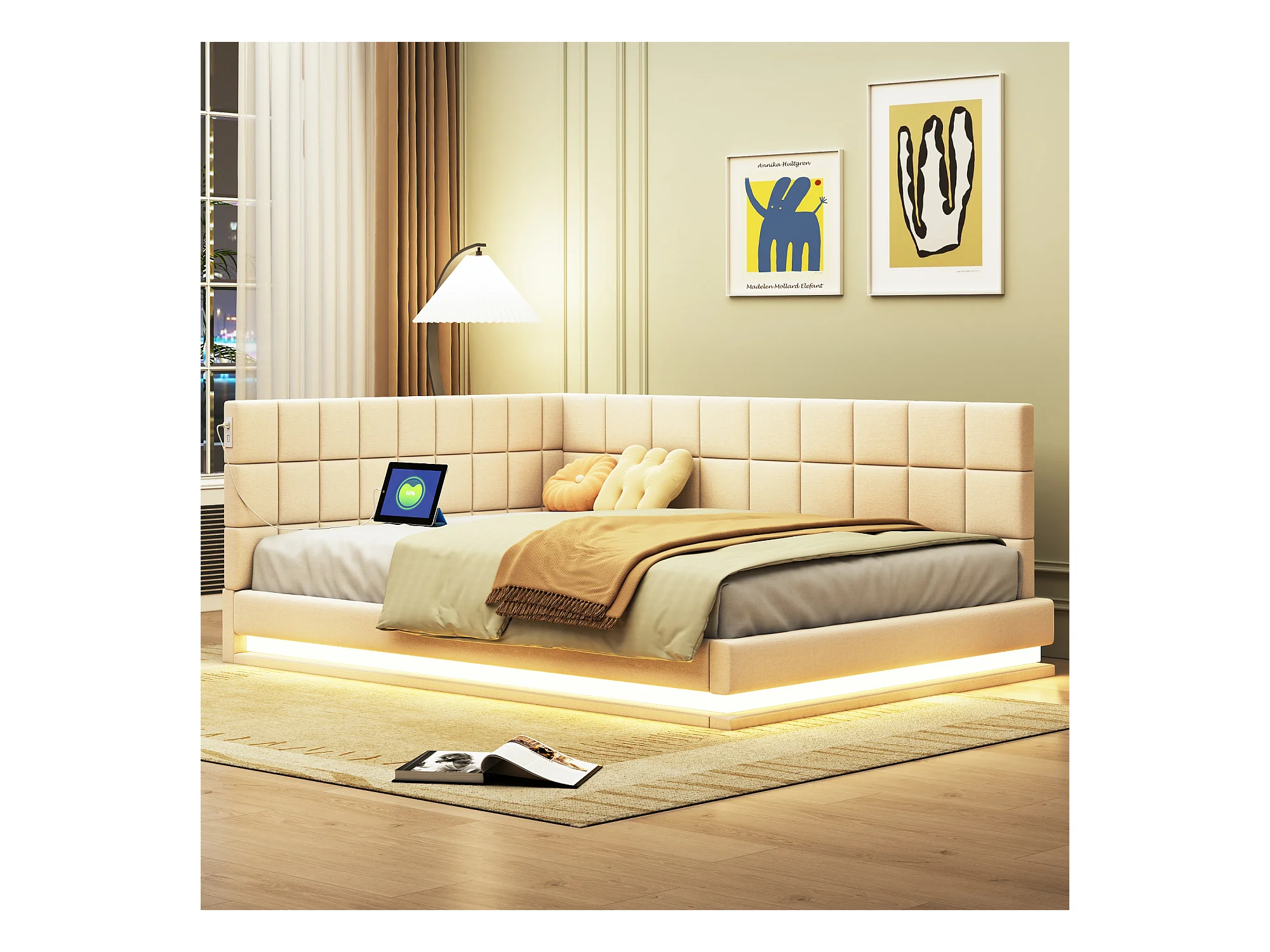 Canapé-lit design, 140x200 cm, avec éclairage ambiant et ports USB/Type-C, lin, beige (213x153x50 cm)