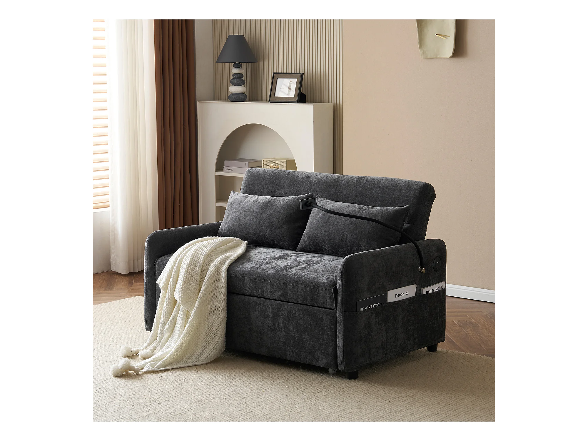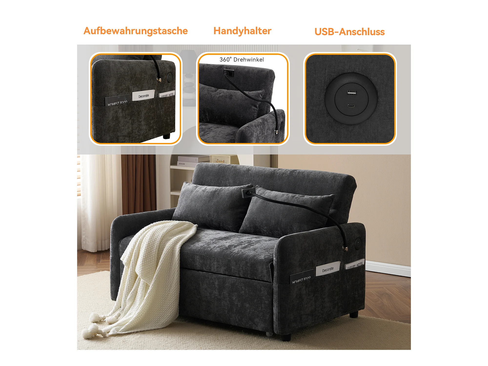 Canapé lit 2 places avec fonction dépliable, en chenille, avec porte-gobelets, USB, gris (129x76x81 cm)