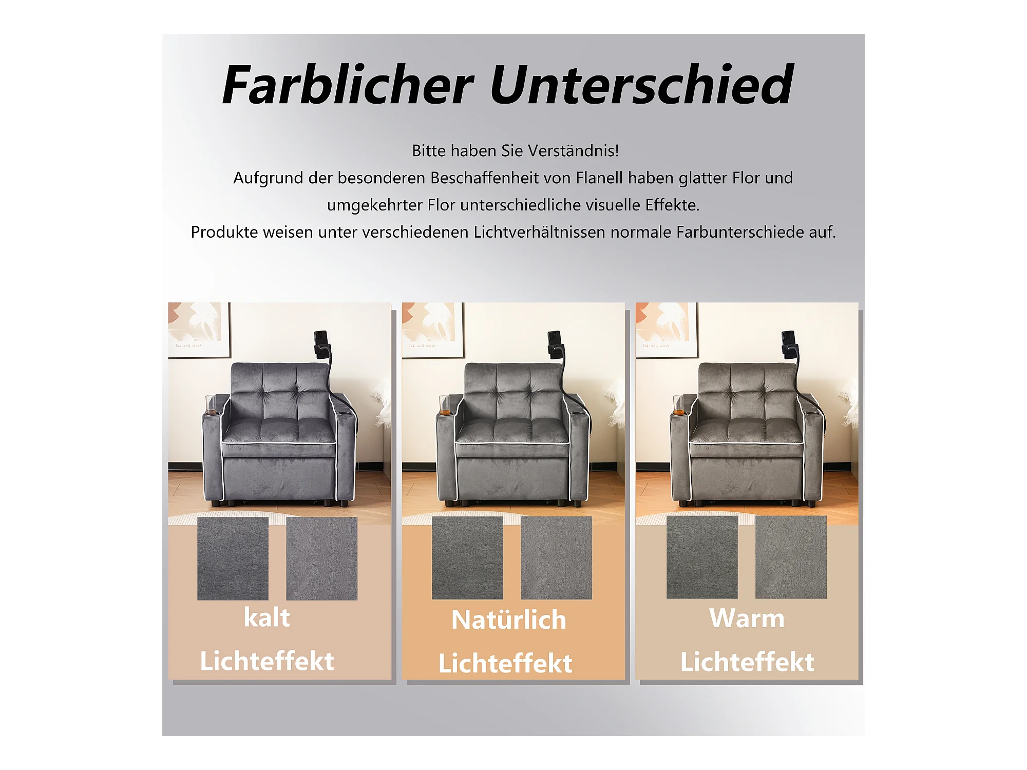 Fauteuil relax multifonction avec dossier escamotable, support pour téléphone, tissu chenille gris (125x84.5x87 cm)