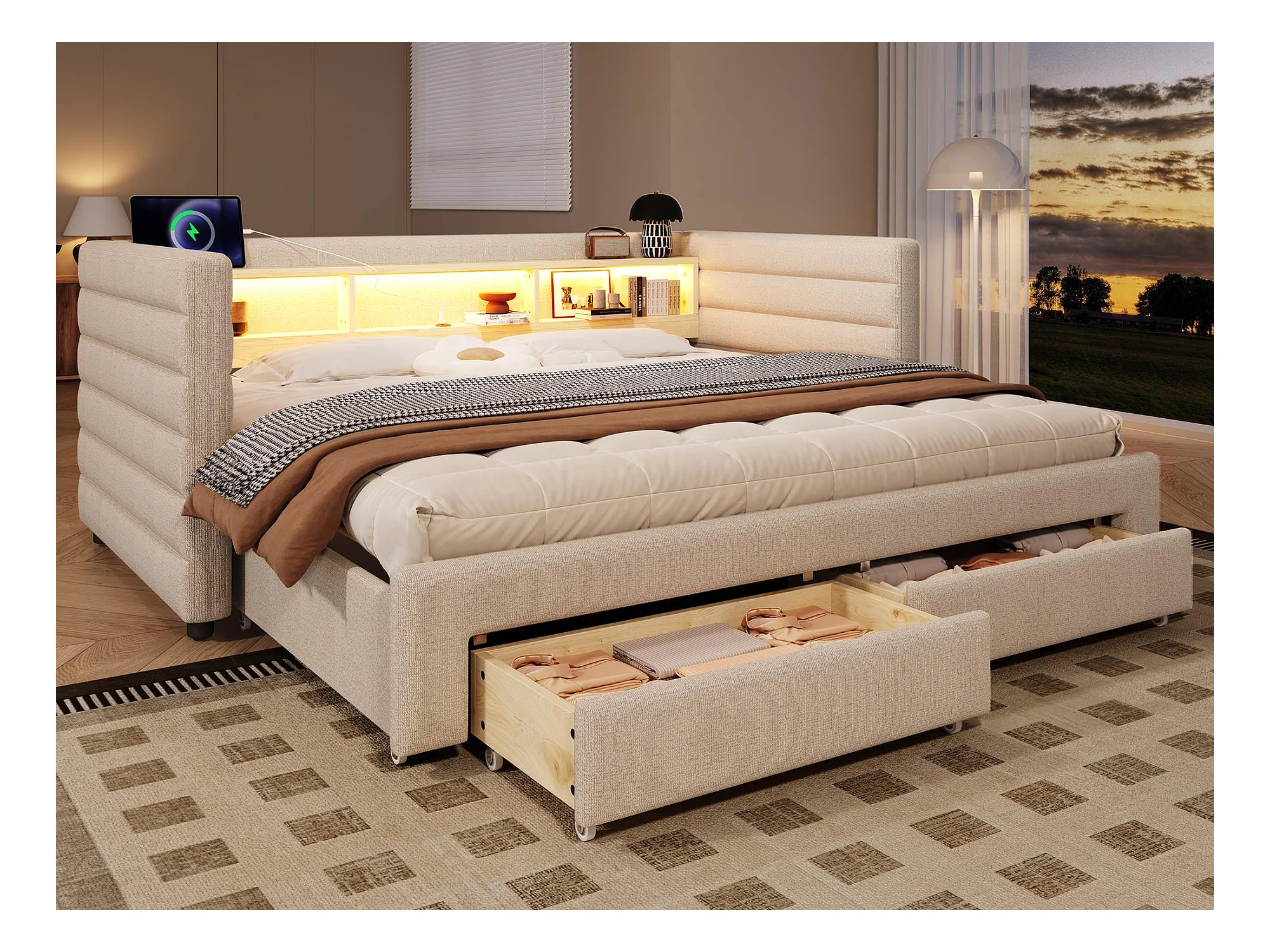 Lit 90x190 cm, Daybed avec 2 Tiroirs, Tête de Lit avec Lampe et USB-C, Velours Beige (203x70x98 cm)