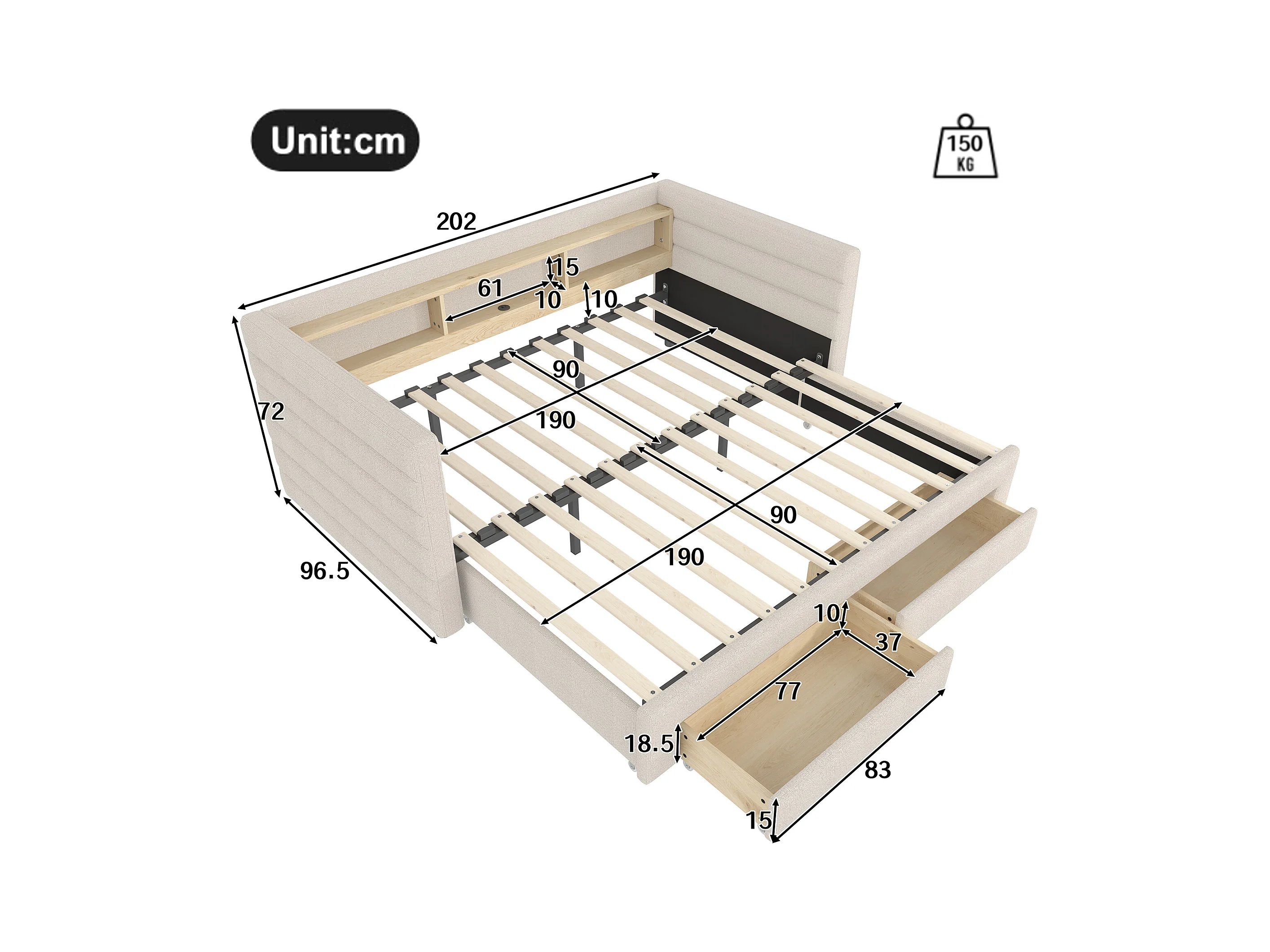 Lit banquette capitonné 90x190 cm - avec lit gigogne 90x190 cm - avec USB et Type-C - avec porte-gobelet - Beige (sans matelas)
