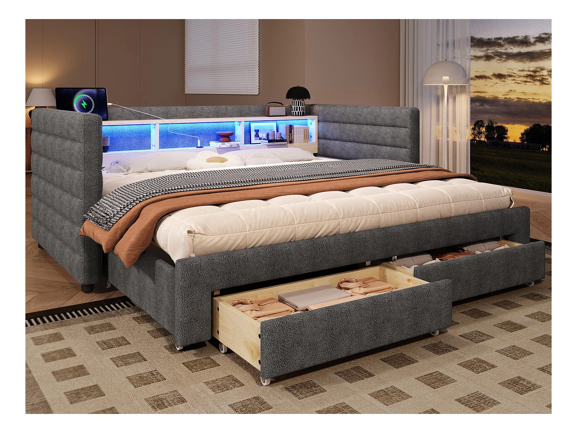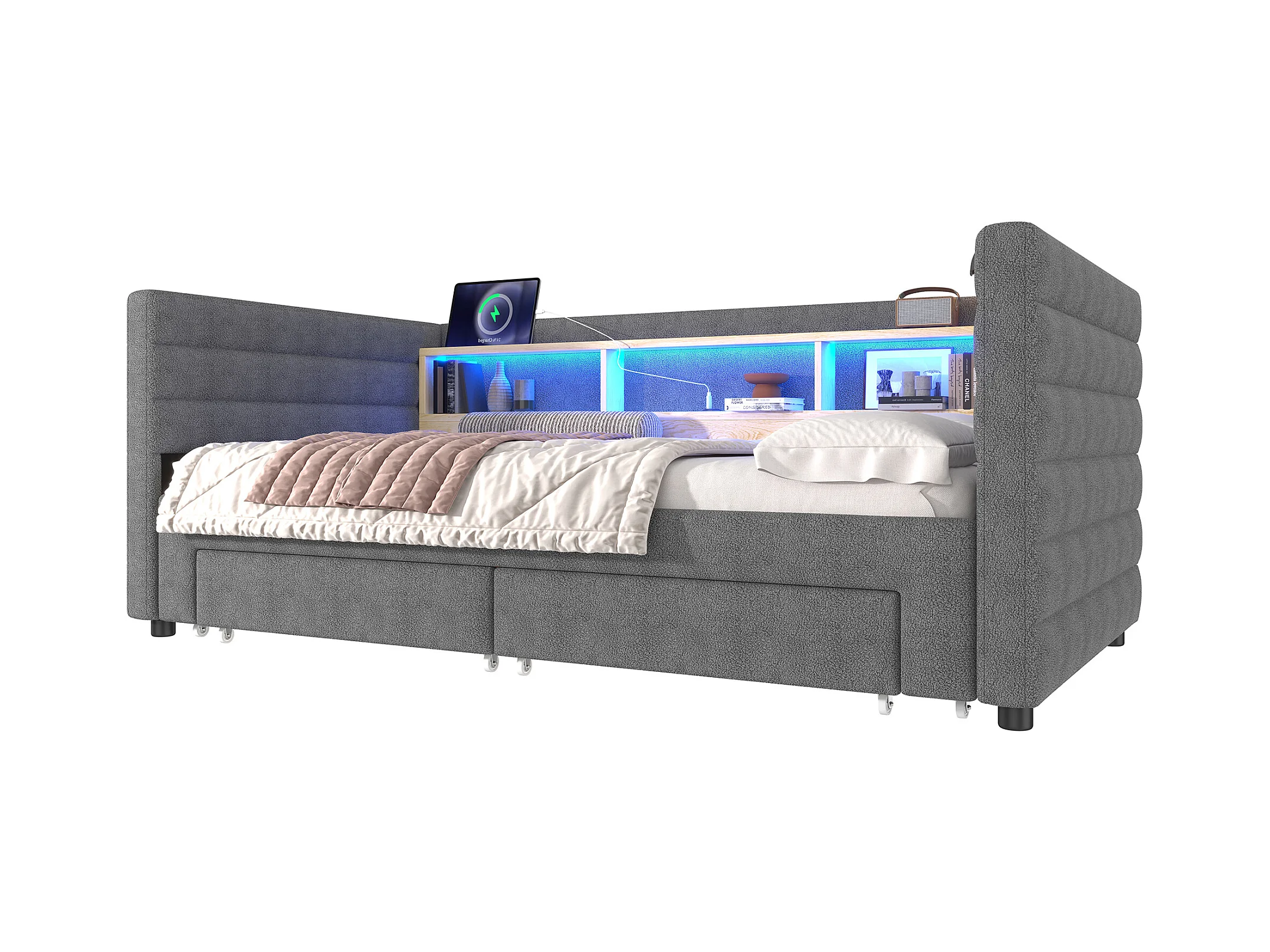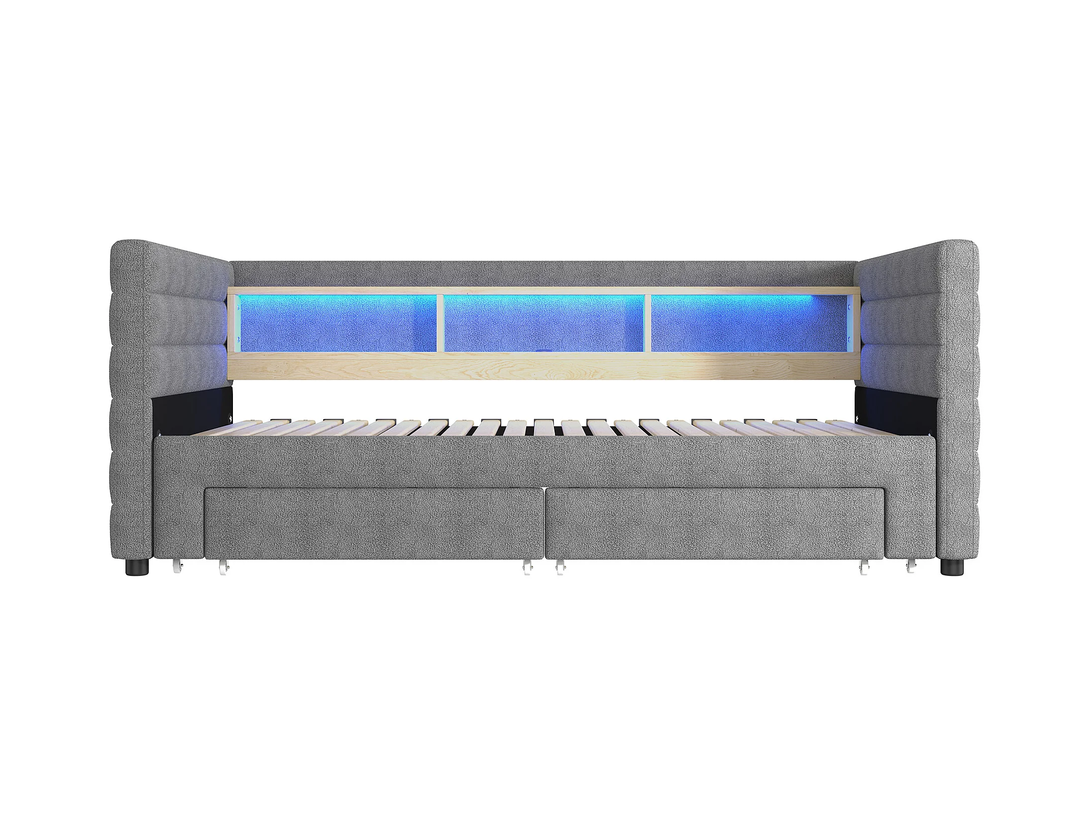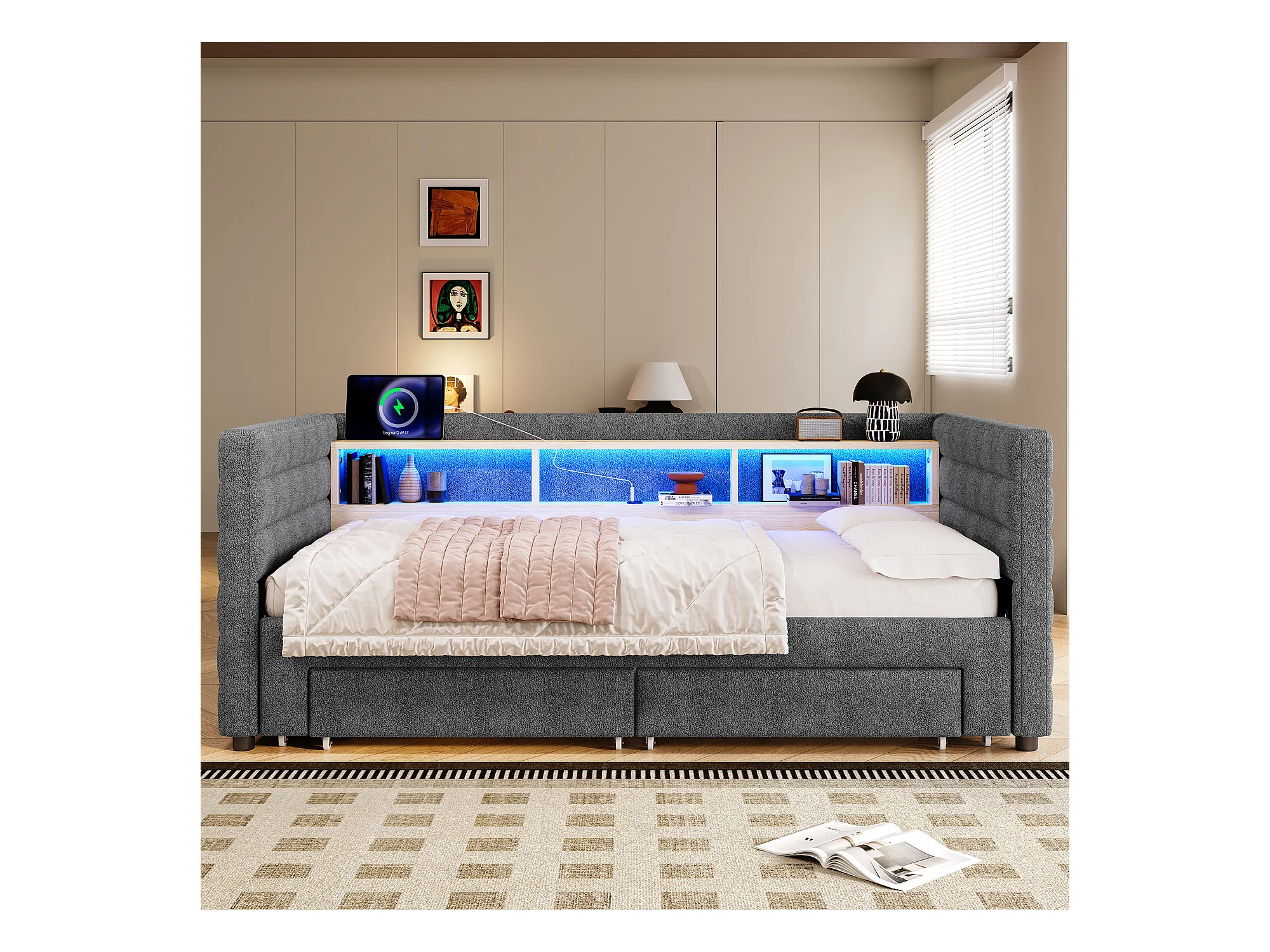 Canapé-lit 90x190 cm - avec lit gigogne - avec ports USB + Type-C - avec 2 tiroirs - bande lumineuse LED - gris (matelas non inclus)