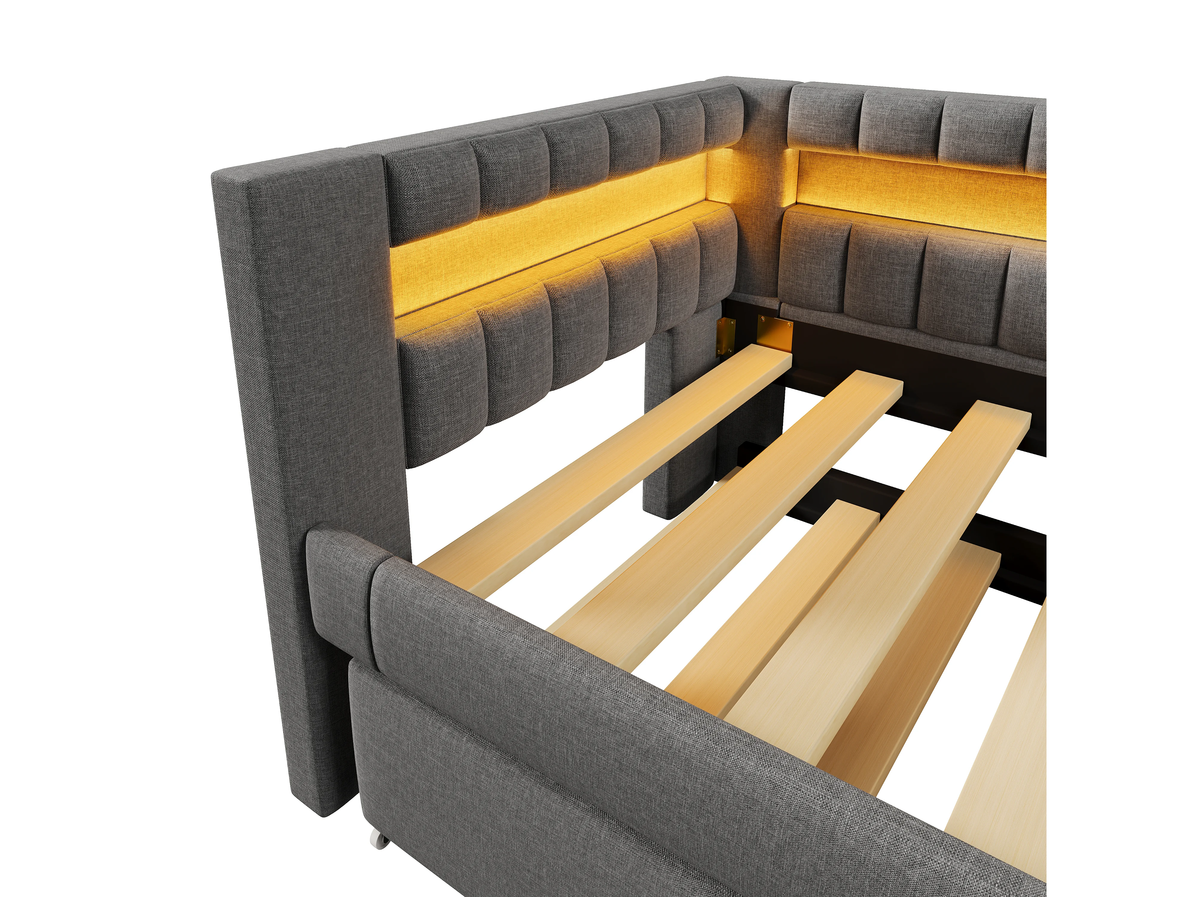 Canapé-lit 90x200 cm - avec éclairage LED - avec lit gigogne - avec USB + TYPE-C - lin - gris (matelas non inclus)