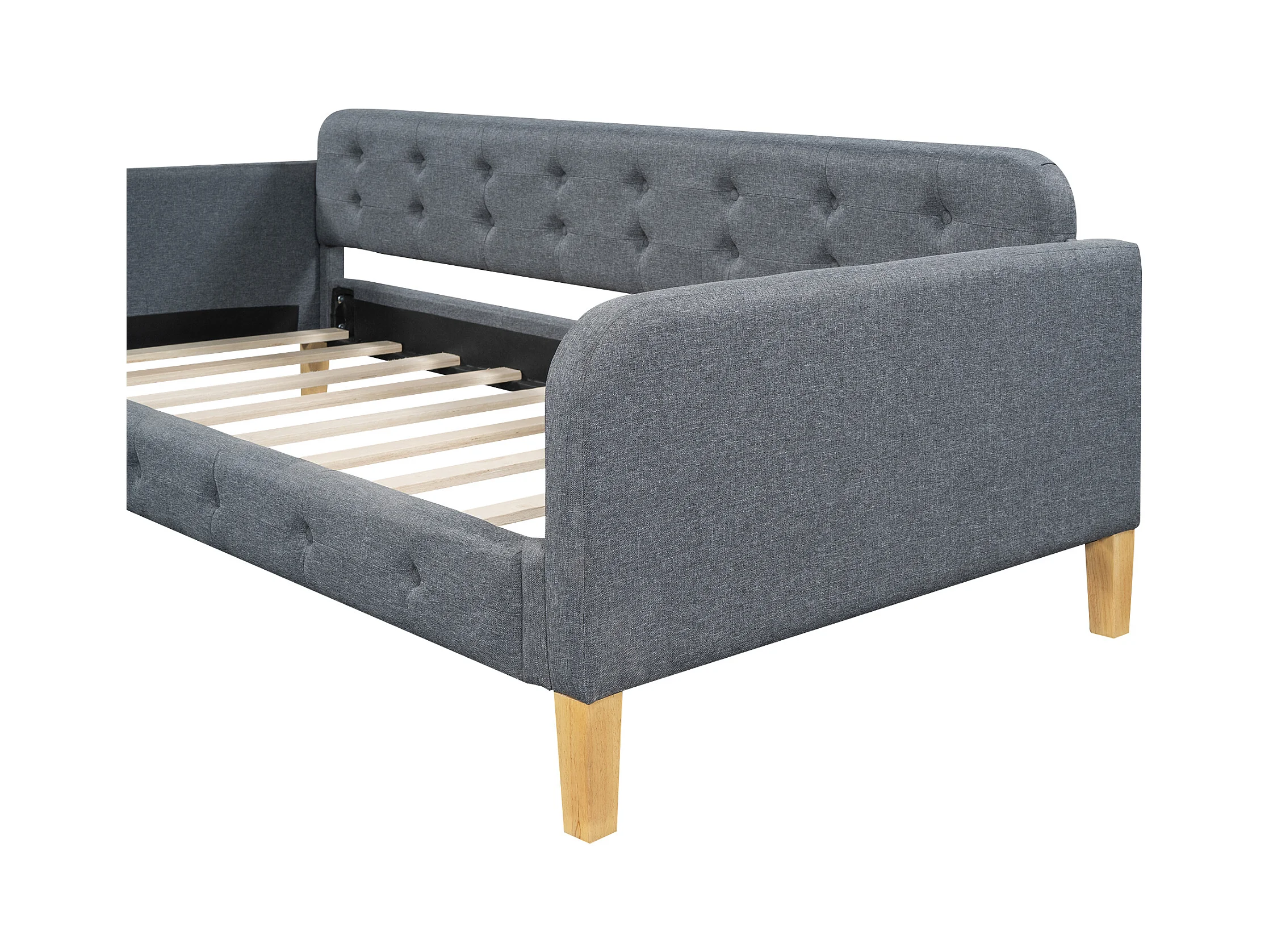 Sofabett 90x200 cm avec tête de lit vintage, 2 tiroirs de rangement, cadre en lin gris, sommier en bois (222x99x72 cm)