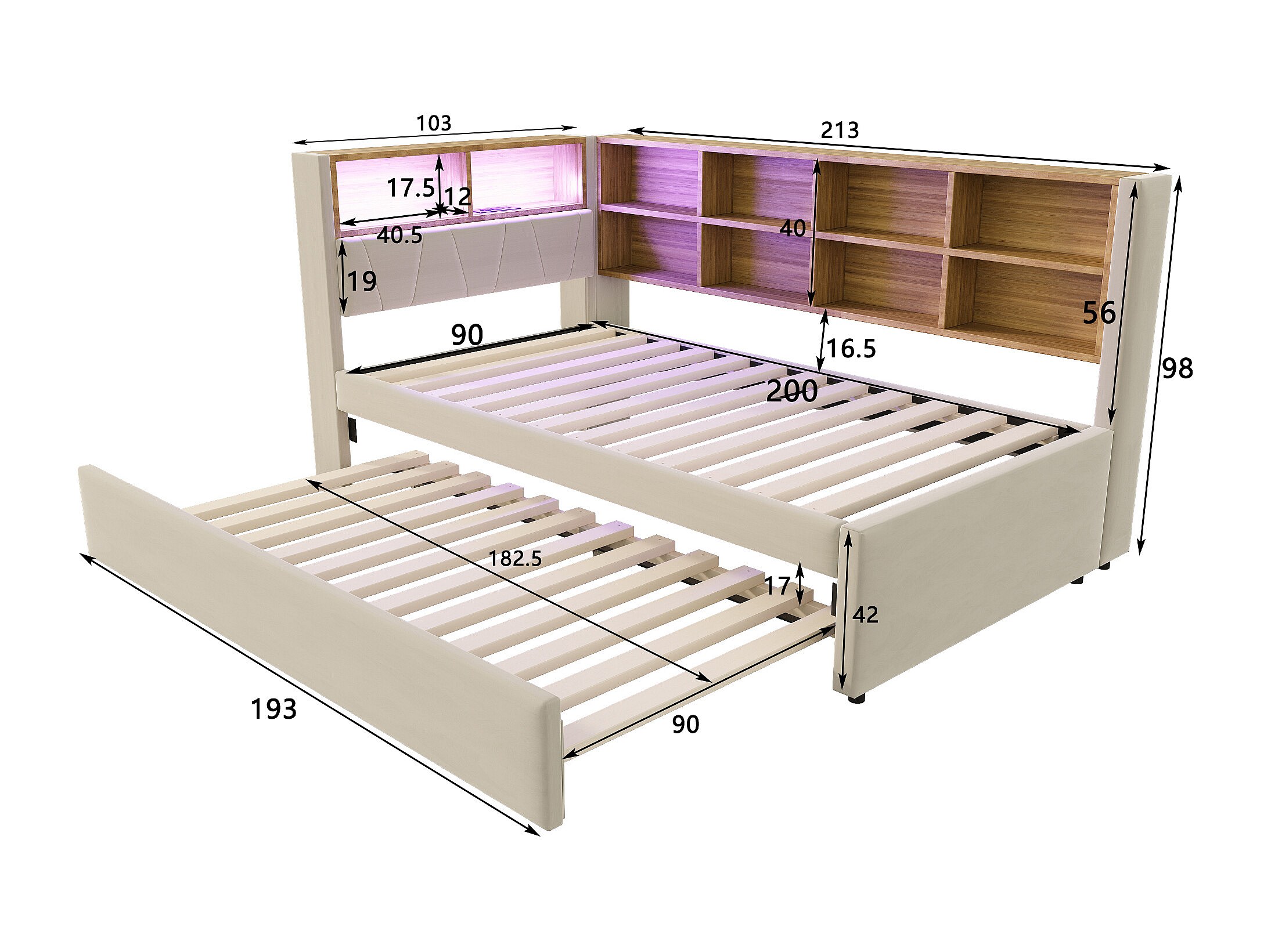 Lit banquette 90x200cm avec LED + lit gigogne 90x190cm - rembourré en tissu velours - Beige (matelas non inclus)