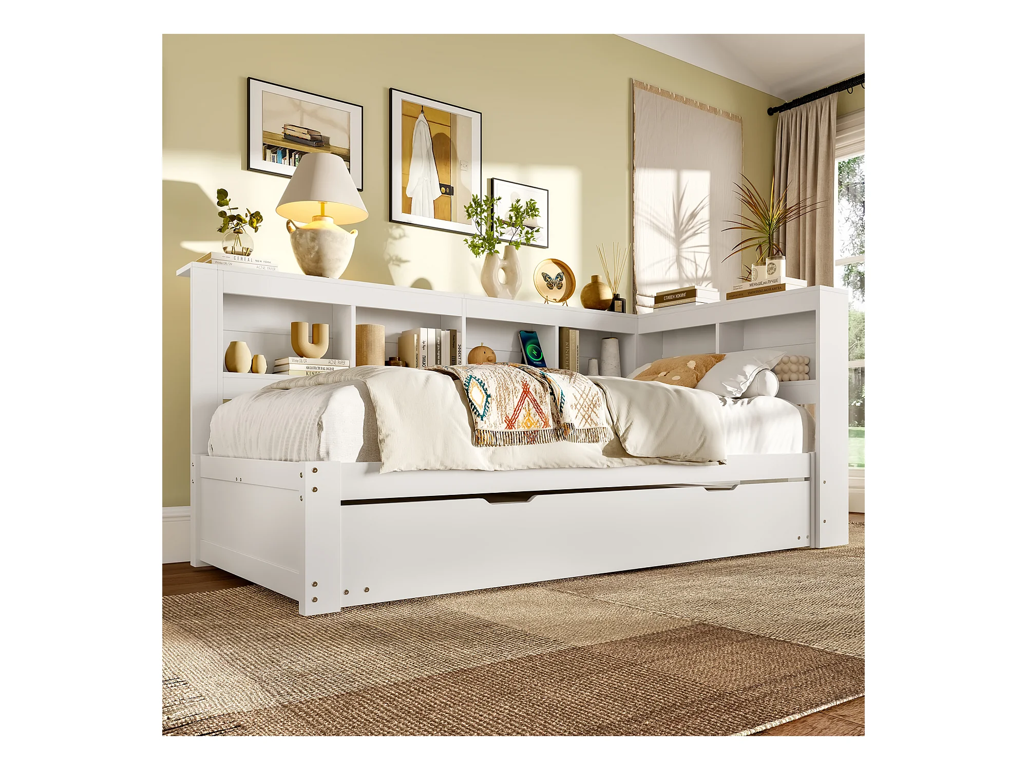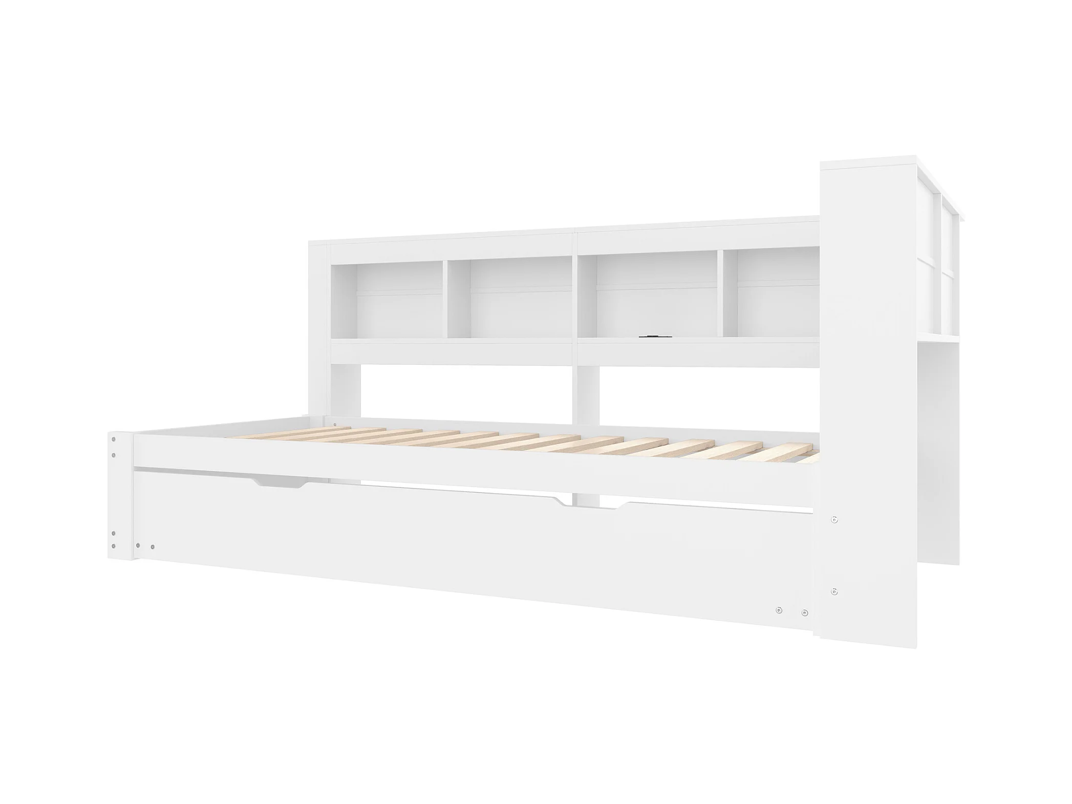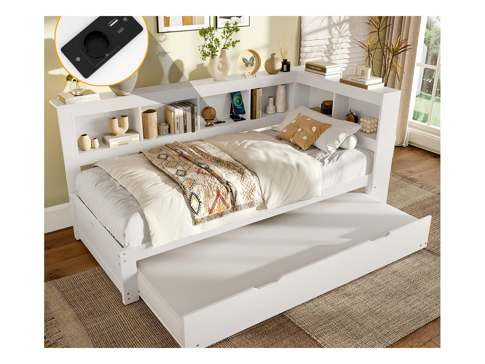 Lit banquette blanc 90x200cm avec lit gigogne 90x190cm, prise de courant et 2 ports USB, rangement (sans matelas)