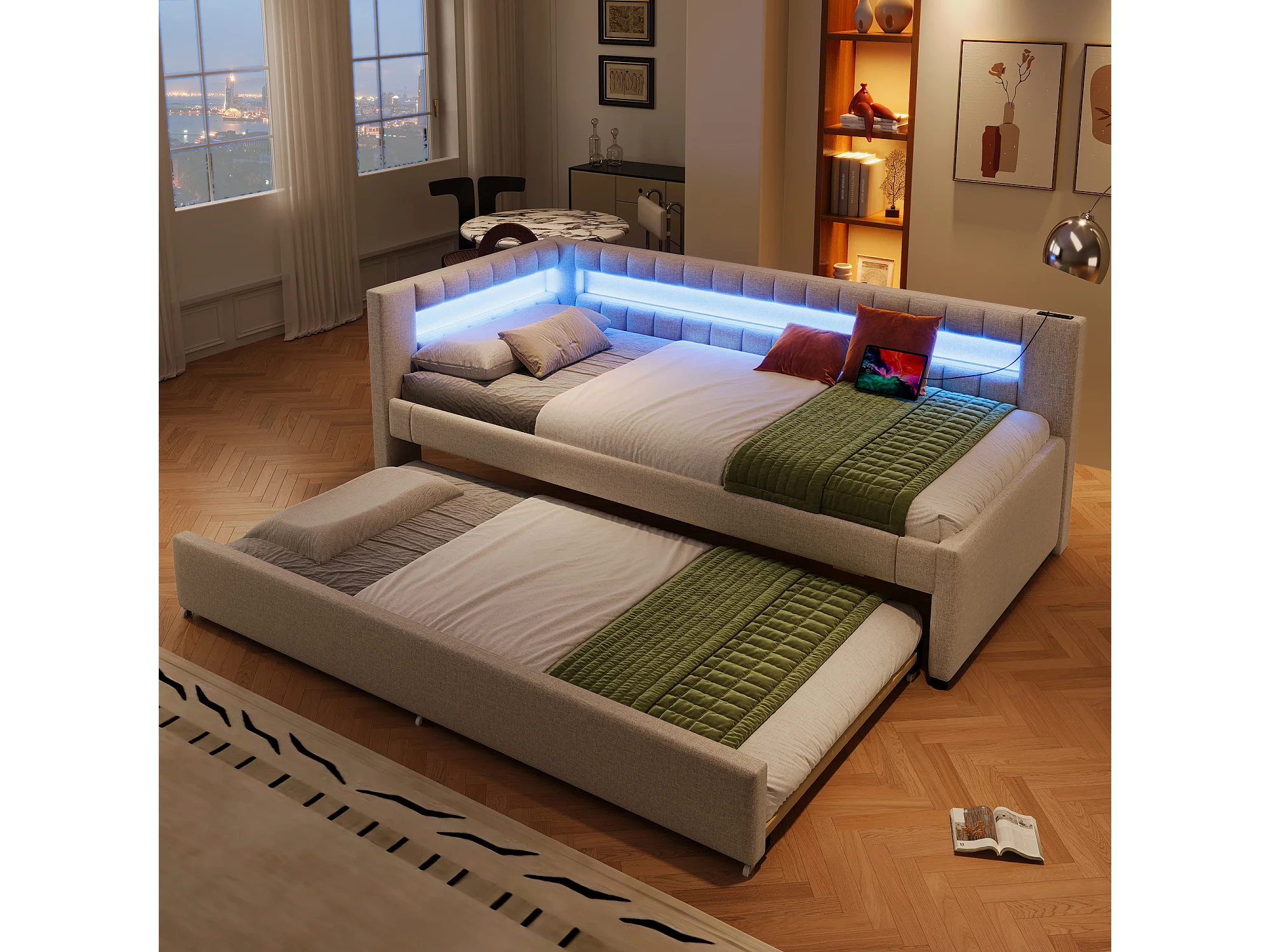 Canapé-lit 90x200cm - avec éclairage LED - avec lit gigogne - avec USB + TYPE-C - lin - beige (matelas non inclus)